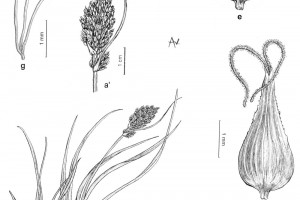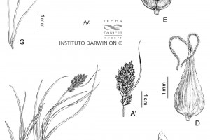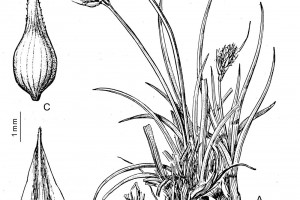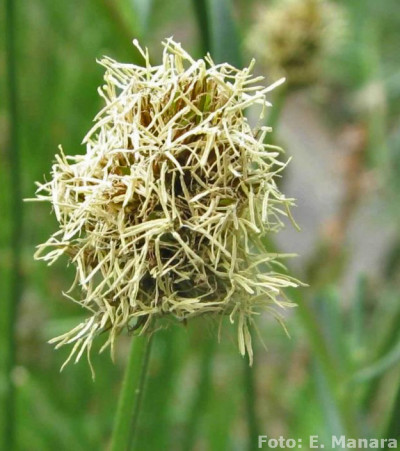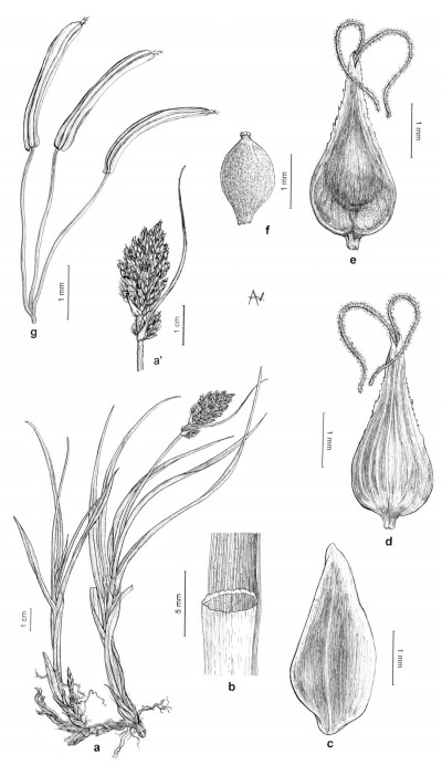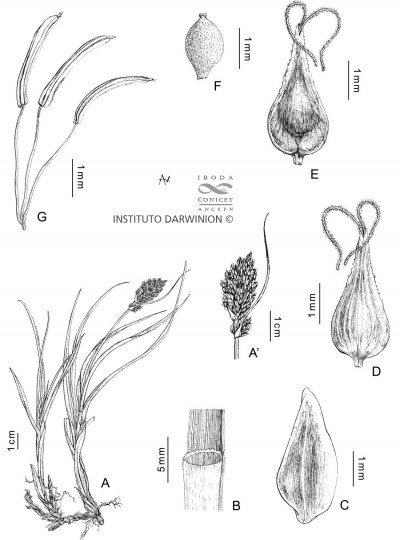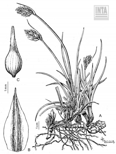 Rizoma leñoso. Tallo de 15-30 cm de alto, triquetro, escabroso en lo alto. Hojas más cortas que el tallo, de 3-4 mm de ancho. Espiguillas numerosas, andróginas, dispuestas en espiga de 3 cm, subdensa, generalmente ebracteada; glumas ovales de color herrumbroso de bordes hialinos anchos. Utrículos poco más largos, ovales, plano-convexos, lisos, lustrosos, paucinervados en el dorso, de base esponjosa, brevemente estipitados, de bordes engrosados, gradualmente atenuados en rostro mediocre brevemente bidentado, estigmas 2.