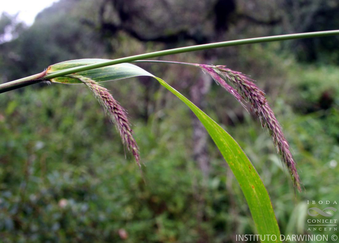 Plantas perennes, cespitosas, robustas, ramificadas en la parte superior, sin rizomas; cañas gruesas, lignificadas, de aspecto bambusoide, huecas, de 1-3 m de alto y 6-17 mm de diámetro, con los nudos y entrenudos glabros; vainas glabras, sin yema en su axila; lígulas pestañosas, formadas por un anillo de pelos cortos de 1-2 mm de largo; láminas planas, lanceoladas, anchas en las ramas principales y sucesivamente más angostas en las ramas secundarias, de 15-40 x 1,5-3,5 cm, glabras en la cara externa, escabrosas en la interna, de base atenuada a pseudopeciolada (pseudopecíolo hasta de 1 cm de largo) en las hojas maduras y base ± redondeada en las hojas jóvenes, con el ápice agudo y el nervio medio conspicuo en la base foliar y difuso hacia el ápice. Inflorescencia con panojas espiciformes axilares y terminales dispuestas en forma alterna sobre un mismo eje, densas, elípticas, exertas, generalmente péndulas, pajizas o tostadas, de 3-6,5 x 1,7-3 cm considerando las setas (0,7-1 cm de ancho excluyendo las setas); pedúnculos cilíndricos, filiformes, hasta de 7 cm de largo, generalmente curvos; raquis de la panoja, normalmente flexuoso, glabro o escabroso, no dispuesto en zig-zag; involucro formado por 16-48 setas lineal-escabrosas, en su mayoría mucho más largas que las espiguillas (de 1,5-2,5 veces), de 5-16 mm de largo y una sola seta lineal-escabrosa notablemente más larga y gruesa que las restantes, de 12-25 mm. Espiguillas lanceoladas, solitarias en cada involucro, dorsalmente comprimidas, de 4-5 x 1-1,2 mm, glabras a escabrosas, sésiles o cortamente pediceladas, 2-floras, con el antecio inferior neutro y el superior perfecto, base de la espiguilla con anillo de pelos; gluma inferior generalmente ausente, cuando presente muy reducida (menor de 0,5 mm de largo), enervia, de ápice redondeado; gluma superior membranácea, de 0,5-1,5 mm de largo, enervia o 1-nervia, de ápice agudo a redondeado; lemma inferior lanceolada, de 4-5 x 1-1,3 mm, 3-5-nervia, de ápice agudo o mucronado; pálea inferior ausente; lemma superior lanceolada, de igual largo que la lemma inferior, 3-5(-7)-nervia, de ápice agudo; pálea superior levemente menor que la lemma; estambres 3, anteras de 1-2 mm de largo, de ápice glabro, con los filamentos estaminales rara vez exertos; gineceo con las ramas estigmáticas exertas, de 2,5-4 mm de largo, estilos apenas soldados en la base; cariopsis globosa, ca. 1,5-3 mm de largo.