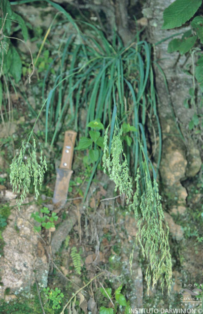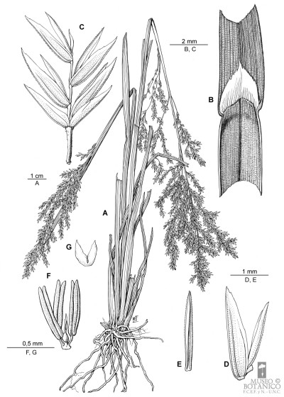 Plantas dioicas, perennes, verde-azuladas, cespitosas, de gran porte, algo suspendidas, nutantes, innovaciones intravaginales; cañas de (30-)50-100(-140) cm de alto, gráciles, erguidas a péndulas, 2-3 mm diámetro, nudos 3-4, exertos; vainas de 10-20(-30) cm de largo, comprimidas, sub-cilíndricas, estriadas, lisas, sobrepasando los entrenudos basales; lígulas truncadas, membranáceas, de 1-2(-4) mm de largo; láminas foliares de 15-50(-60) cm x 4-8 mm, firmes, plegadas o planas, glabras. Inflorescencias de (6-)12-30 x 4-10 cm, difusas a piramidales, con varias ramas en los nudos basales, amplias, algo péndulas a nutantes, con 11-18 nudos por panoja. Espiguillas pistiladas y estaminadas de 5,5-9 mm de largo, 3-6(-8)-floras; glumas subiguales, con bordes membranáceos; gluma inferior 1(-3)-nervia, la pistilada de 2,5-4,5 x 0,6-0,8 mm, la estaminada de 2-3(-3,5) x 0,4-0,6 mm; gluma superior 3-nervia; callo de los antecios pistilados con pelos lanosos, largos o menos frecuentemente glabros, de los antecios estaminados glabros; lemma lanceolada, la pistilada con nervios y quilla pilosos, la estaminada glabra; ambas de 3-4,5(5) x 0,6-0,8 mm; pálea de 2-3,5 x 0,4-0,6 mm, nervios de la pistilada ciliados; estaminodios con las anteras diminutas de 0,2-0,5 mm de largo; estambres de las flores estaminadas con anteras de 1,7-2,5 mm de largo.
