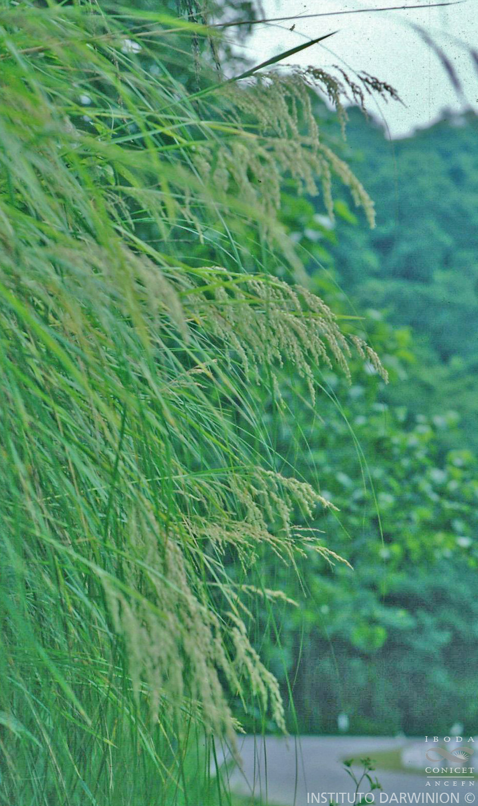 Plantas dioicas, perennes, verde-azuladas, cespitosas, de gran porte, algo suspendidas, nutantes, innovaciones intravaginales; cañas de (30-)50-100(-140) cm de alto, gráciles, erguidas a péndulas, 2-3 mm diámetro, nudos 3-4, exertos; vainas de 10-20(-30) cm de largo, comprimidas, sub-cilíndricas, estriadas, lisas, sobrepasando los entrenudos basales; lígulas truncadas, membranáceas, de 1-2(-4) mm de largo; láminas foliares de 15-50(-60) cm x 4-8 mm, firmes, plegadas o planas, glabras. Inflorescencias de (6-)12-30 x 4-10 cm, difusas a piramidales, con varias ramas en los nudos basales, amplias, algo péndulas a nutantes, con 11-18 nudos por panoja. Espiguillas pistiladas y estaminadas de 5,5-9 mm de largo, 3-6(-8)-floras; glumas subiguales, con bordes membranáceos; gluma inferior 1(-3)-nervia, la pistilada de 2,5-4,5 x 0,6-0,8 mm, la estaminada de 2-3(-3,5) x 0,4-0,6 mm; gluma superior 3-nervia; callo de los antecios pistilados con pelos lanosos, largos o menos frecuentemente glabros, de los antecios estaminados glabros; lemma lanceolada, la pistilada con nervios y quilla pilosos, la estaminada glabra; ambas de 3-4,5(5) x 0,6-0,8 mm; pálea de 2-3,5 x 0,4-0,6 mm, nervios de la pistilada ciliados; estaminodios con las anteras diminutas de 0,2-0,5 mm de largo; estambres de las flores estaminadas con anteras de 1,7-2,5 mm de largo.