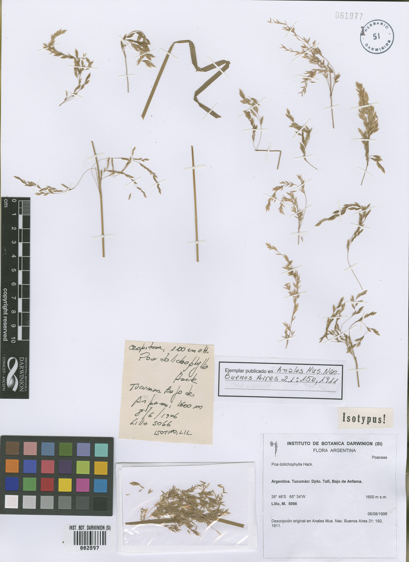 Observaciones: Poa dolichophylla lleva el nombre de un complejo taxonómico conformado por tres especies dioicas afines (Giussani, 2000), que crecen en las sierras pampeanas, región noroccidental (P. dolichophylla), Córdoba y San Luis (P. stuckertii) y sierras de la provincia de Buenos Aires (P. iridifolia). Poa dolichophylla se distingue de las otras por su gracilidad, su aspecto nutante cuando crece sobre pendientes, y menor ancho de láminas.