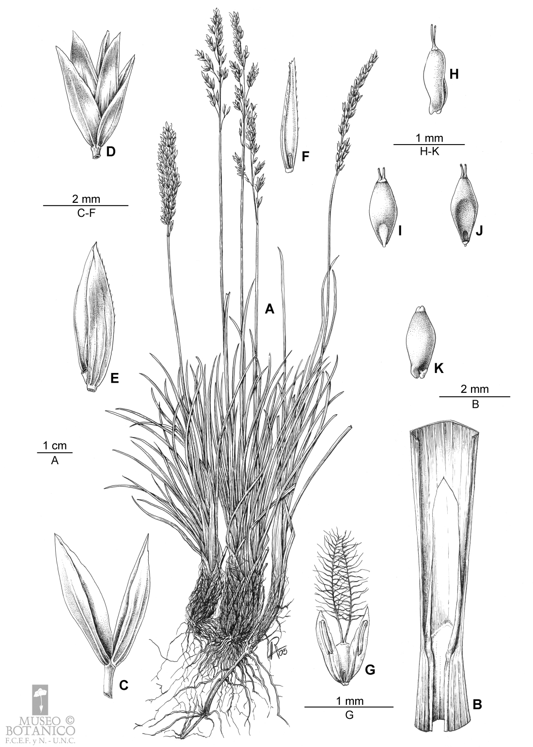 A, hábito; B, lígual; C, glumas; D, espiguilla; E, lemma; F, pálea; G, flor pistilada; H-K, cariopsis.