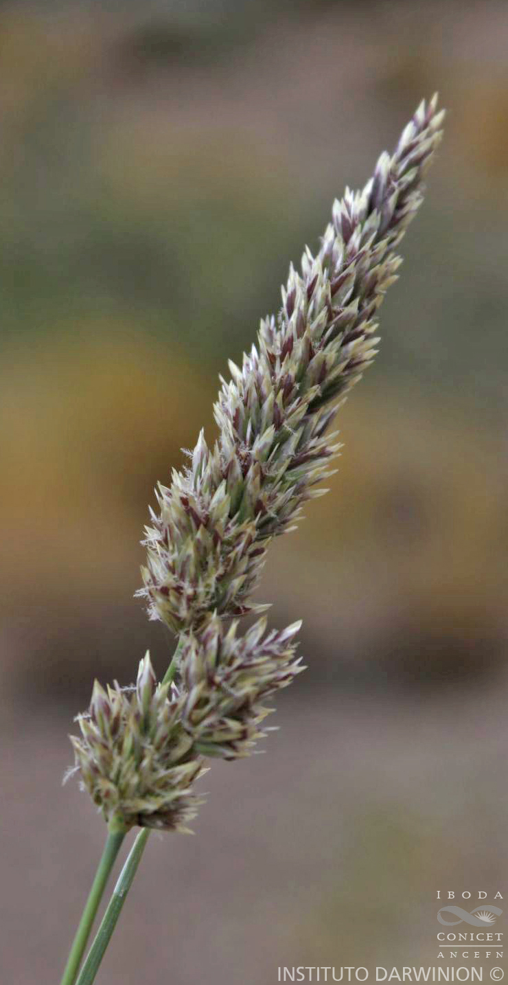 Plantas dioicas, perennes, cespitosas, con innovaciones intravaginales formando matas de gran porte; cañas de 10-50 cm de alto, erguidas, rígidas, nudos 2-3, exertos; vainas foliares de 4-10 cm de largo, papiráceas, lisas o escabrosas, glabras y brillantes, ensanchándose en la base especialmente si las plantas han sufrido aplastamiento por la nieve; lígulas agudas, membranáceas, de 4-6(-11) mm de largo, láminas foliares de (6-)8-20 cm x 2-4 mm, conduplicadas, rectas, endurecidas, con el ápice generalmente punzante. Inflorescencias de 5-15 x 1-2,5 cm, densas, contraídas, con 8-12 nudos del que nacen ramas arrimadas, adpresas al eje principal. Espiguillas lanceoladas, glabras, las pistiladas de 6-8(-9) mm de largo, las estaminadas de 5-7 mm de largo, 3-5-floras; glumas lanceolado-acuminadas, lustrosas, con carina escabrosa; gluma inferior 1-3-nervia, en los antecios pistilados de 4-5,5 x 0,8-1,2 mm, en los estaminados de 3-4,5 x 0,7-1 mm; gluma superior 3-nervia, de 5-7 mm de largo; callo de los antecios pistilados y estaminados glabro, nervios marginales y quillas glabros; lemmas de los antecios pistilados y estaminados lanceoladas, completamente glabras, en los antecios estaminados de 4-5,5 x 1-1,4 mm, en los antecios pistilados de 5-7 x 1-1,5 mm; pálea de antecios pistilados finamente escabrosa, de 3-4,5 x 0,7-0,9 mm; estaminodios diminutos; anteras de 2,5-3 mm de largo; ovario con estilos cortos y estigmas plumosos; cariopsis castaña, lanceolada, subtrígona, la parte ventral plana, de 2,8-3 mm de largo y adherida a la pálea.