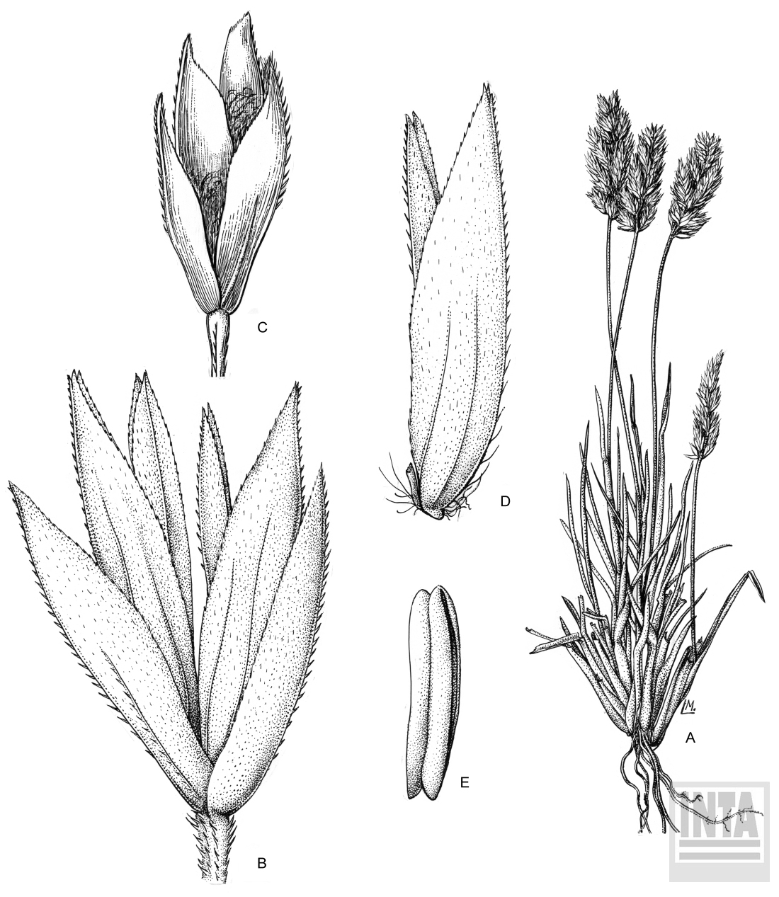 A, planta; B, espiguilla masculina; C, espiguilla fememina; D, antecio masculino; E, antera.