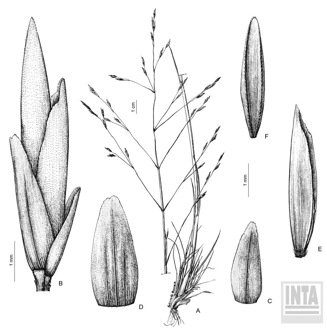 Plantas perennes, cespitosas, de 15-35 cm de alto; cañas glabras; vainas glabras; lígulas membranáceas, ovado-triangulares, de 2,5-6 mm de largo, borde eroso; láminas involutas de 4-11 cm x 3-4 mm, borde y cara adaxial finamente escabrosos, ápice agudo o cimbiforme, no punzante. Inflorescencia una panoja de 12-15 cm de largo, ramas filiformes, desnudas en la base, las basales hasta de 12 cm de largo, reflejas a la madurez; pedicelos y ramas escabrosos. Espiguillas 2-6-floras de 6,5-10 mm de largo; glumas glabras, agudas a subagudas, ápice ciliolado, la inferior 1-3-nervia de 2,2-3 mm, la superior 3-nervia, de 3,2-3,7 mm de largo; raquilla glabra o con escabrosidades en la ½ superior de los artejos, éstos de 0,7-1 mm de largo; lemma semiescabriúscula, glabra, 5-nervia, nervios incons¬picuos, de 4-5 mm de largo, semitranslúcida; pálea lanceolada, quillas escabrosas en los ? superiores; lodículas 2, de 0,5-0,7 mm de largo, 2-lobuladas; estambres 3, anteras de 0,5-0,6 mm de largo; cariopsis de 1,8 x 0,6 mm, hilo basal ovoide.