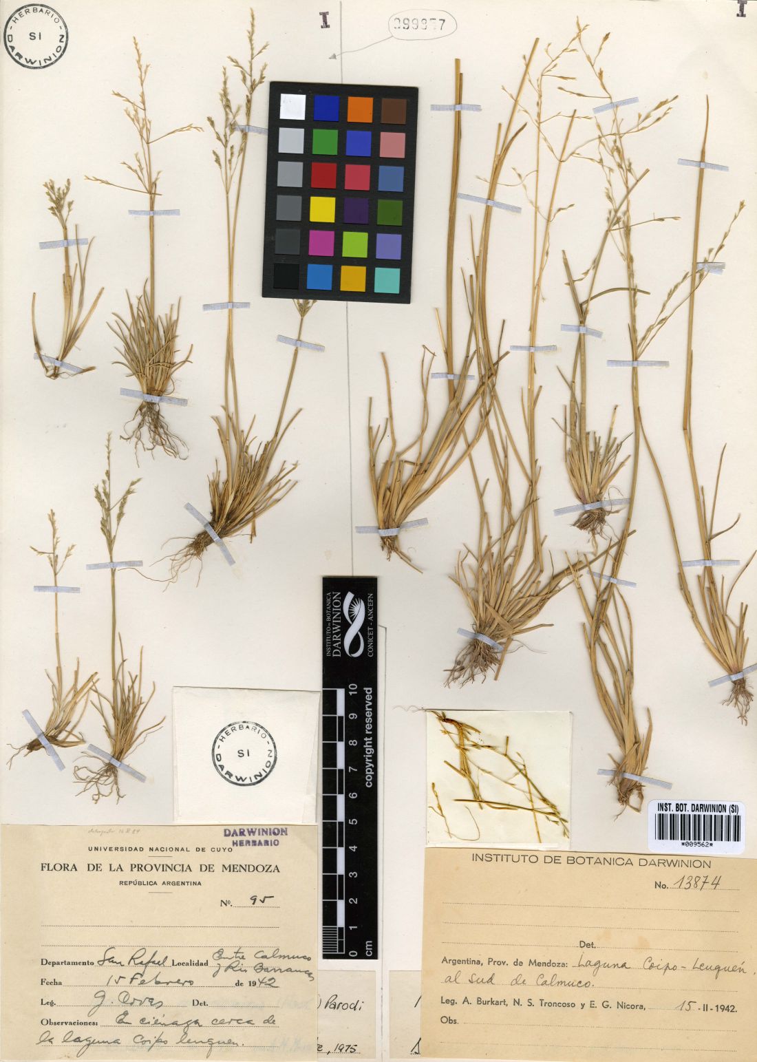 Plantas perennes, cespitosas, glaucas, de 10-40 cm de alto, cañas floríferas glabras, 1-2-nodes; vainas glabras, mayores o poco menores que los entrenudos; lígulas membranáceas, agudas a subobtusas, de 2-4 mm de largo; láminas lineares, estrechas, subconvolutas, de ápice navicular, glabras en la cara abaxial, escabriúsculas en la adaxial, las inferiores hasta de 15 cm de largo, las de la caña de 1,5-7 cm x 0,6-2 mm. Inflorescencia una panoja erguida, laxa o contraída, de 4,5-10 cm de largo, ramas inferiores verticiladas, las mayores de 2-5 cm de largo; ramas y pedicelos escabrosos, ramificaciones erectas o contraídas antes de la antesis, divergentes y reflexas a la madurez. Espiguillas lineares, 2-7-floras, de 3,5-7,5 mm de largo; glumas glabras, obtusas o subobtusas, de ápice ciliolado, la inferior 1-3-nervia, de 0,8-1,5 mm de largo, la superior 3-nervia, de 1,4-1,8(-2,4) mm de largo; raquilla glabra, artejos de 0,6-0,8 mm de largo; lemma 5-nervia, glabra a brevemente pubescente en el tercio inferior de los nervios, de 3,2-3,6 mm de largo, obtusa a subobtusa, el ápice a menudo eroso; pálea lanceolada, glabra, de 2,4-3 mm de largo, biaquillada, las quillas escabrosas en la ½ superior; callo con pelos cortos, rígidos; lodículas 2, ca. 0,7 mm de largo; estambres 3, anteras de 0,7-1,8 mm de largo; cariopsis oblongoidea a lanceolada, de 1,4-1,8 x 0,4 mm, hilo basal oval.