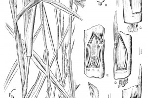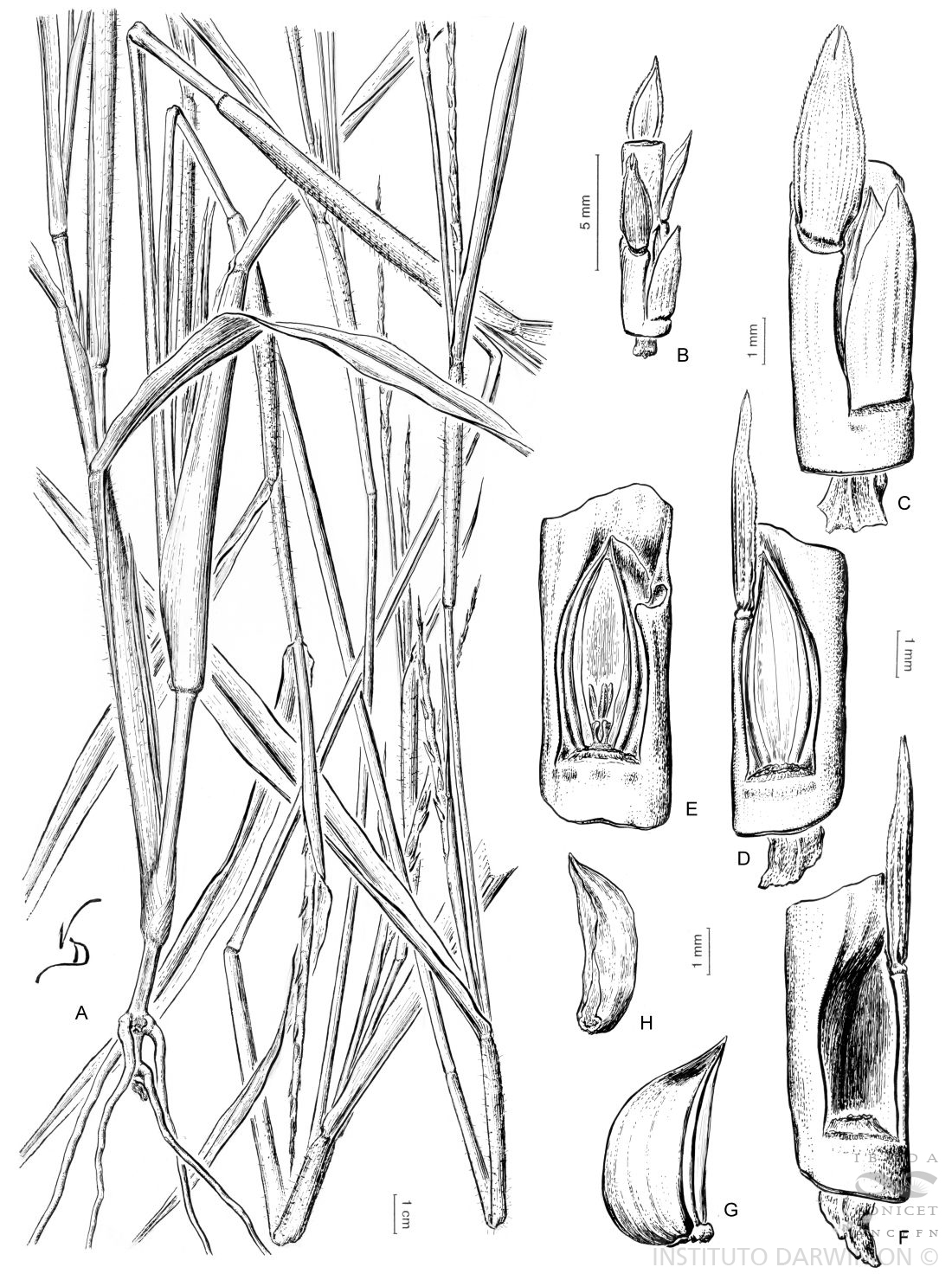 A. Planta. B. Dos artejos del raquis con dos pares de espiguillas. C. Artejo del raquis con un par de espiguillas vistas por el dorso de las glumas inferiores. D. Artejo del raquis, espiguilla sésil sin la gluma inferior para ver la lemma inferior. E. Artejo del raquis con espiguilla sésil sin la gluma inferior y la lemma inferior, dejando ver la pálea, lodículas y androceo. F. Artejo del raquis con la espiguilla pedicelada, ésta con el pedicelo soldado al raquis. G. Antecio superior de la espig