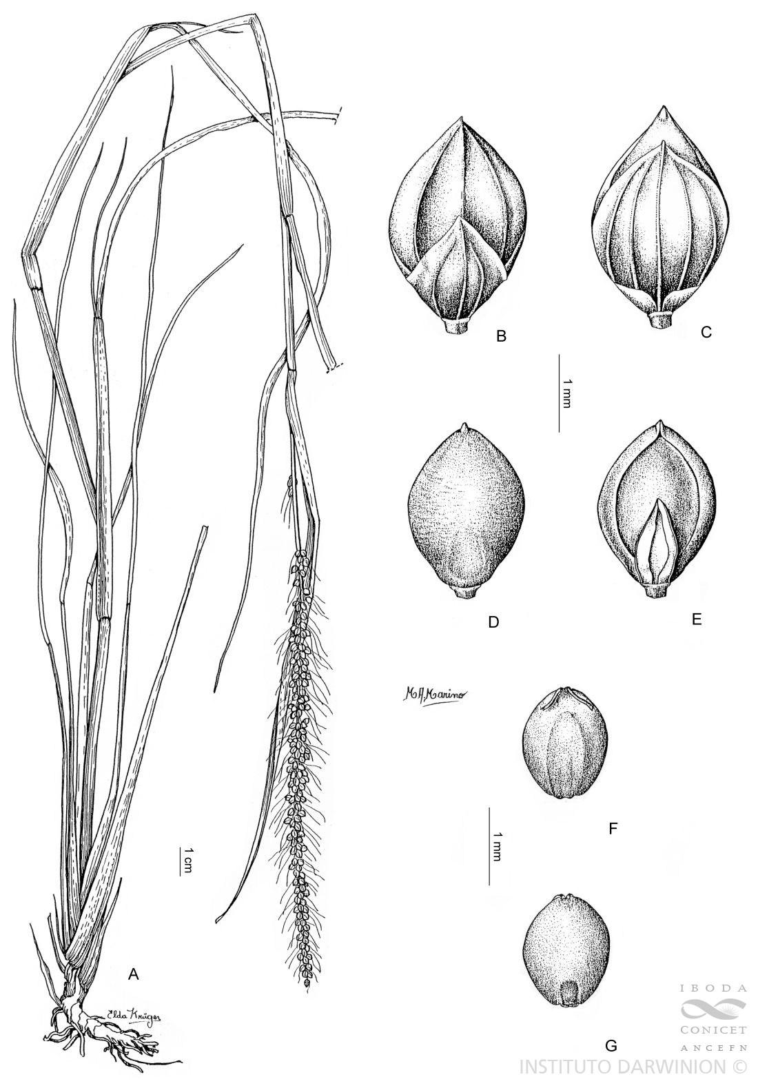 A. Planta. B. Espiguilla vista ventral. C. Espiguilla vista dorsal. D. Antecio superior vista dorsal. E. Pálea inferior y antecio superior vista ventral. F. Cariopsis vista escutelar. G. Cariopsis vista hilar.