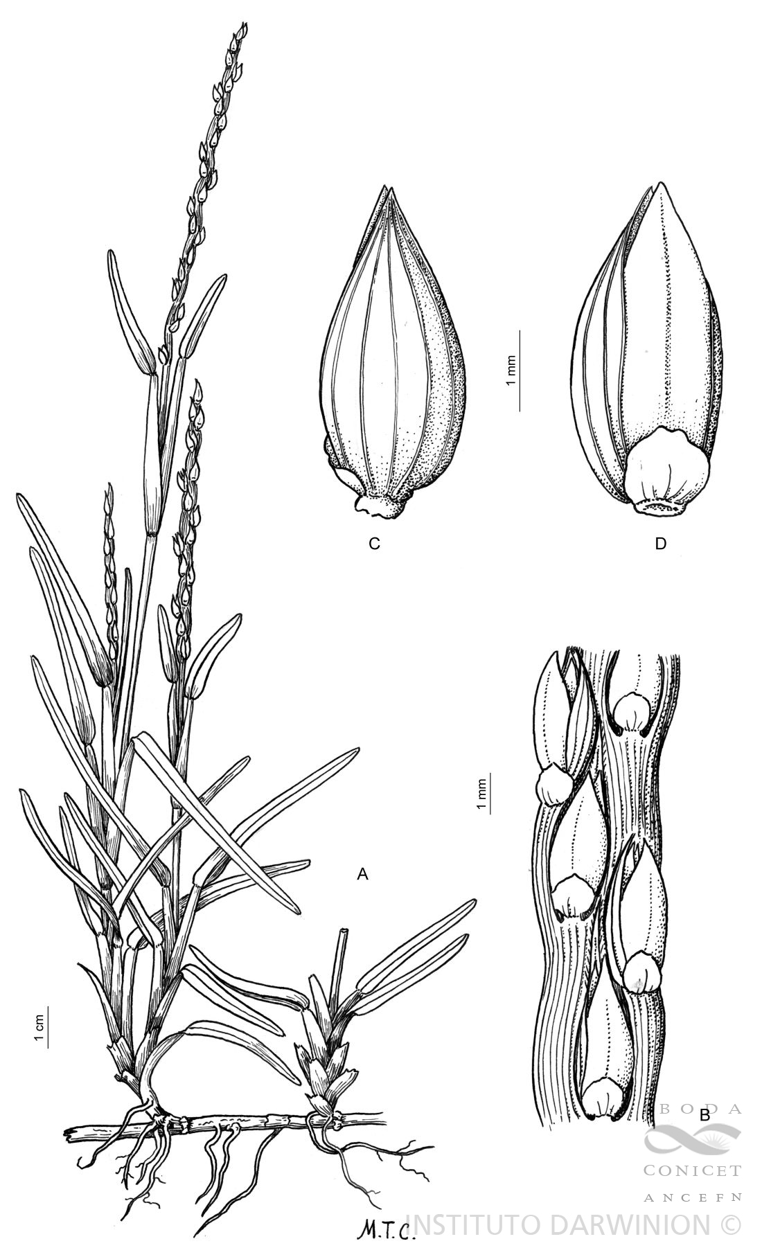 Plantas rastreras con estolones rígidos arraigados en los nudos; cañas profusamente ramificadas, porción erecta de 10-30 cm de alto; entrenudos comprimidos, glabros; vainas usualmente superpuestas, anchas, flojas, lateralmente comprimidas, glabras a cortamente pubescentes hacia la porción distal, los márgenes membranáceos; lígulas de 0,3-0,5 mm de largo, cortamente pestañosas; láminas lineares a linear-lanceoladas, de 3-10 cm x 2-7 mm, planas a conduplicadas, glabras, base atenuada y ápice obtuso y mucronado. Inflorescencias espiciformes, terminales o axilares, de 2,5-17 cm x 3-5 mm, exertas a parcialmente incluidas en las vainas foliares; eje principal ensanchado, corchoso, hasta de 5 mm de ancho, verdoso, glabro, con excavaciones sobre una de las caras; espiguillas solitarias o en pares, alojadas en las excavaciones, sésiles o una sésil y la restante pedicelada, sobre un raquis terminando en una prolongación estéril. Espiguillas elipsoides, de 3,5-5 x 1,2-1,6 mm, glabras, obtusas; gluma inferior de 1-2 mm de largo, membranácea, de ápice redondeado; gluma superior y lemma inferior tan largas como la espiguilla, endurecidas, con los nervios no manifiestos; pálea inferior tan larga como el antecio superior, membranácea, 2-nervia; flor inferior estaminada; antecio superior ovoide, de 3,2-4,4 x 1-1,3 mm, endurecido, liso, glabro; lodículas 2, truncadas; estambres 3, anteras de 2,3-2,5 mm de largo; cariopsis no vista.