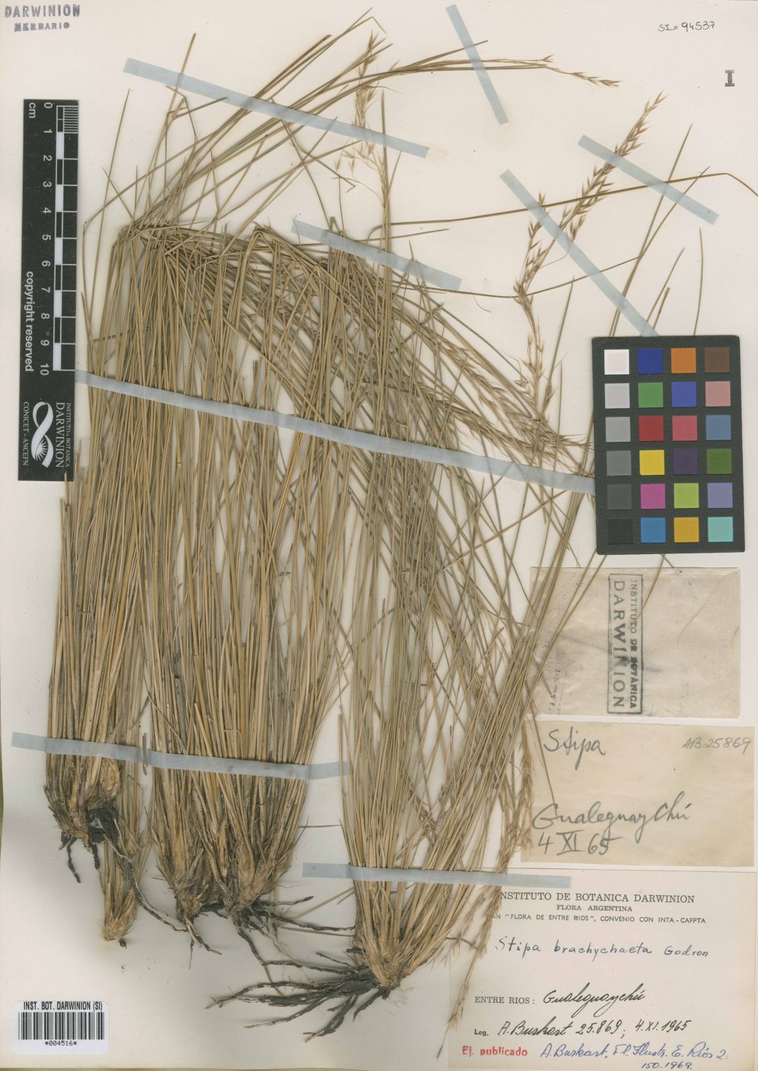 Plantas perennes, cespitosas, robustas, de 40-90 cm de alto; cañas cilíndricas, de 1-3(-4) mm de diámetro, erguidas, rectas, simples, paucinodes; nudos muy levemente comprimidos, pajizos, glabros; entrenudos inconspicuamente estriados, glabros; vainas foliares estriadas, mayores a menores que los entrenudos, glabras, con márgenes ciliados hacia el ápice y lóbulos vilosos, cuello glabro; lígulas truncadas u obtusas, de 0,2-0,5 mm de largo, membranáceas, con pelos en el dorso y el margen; láminas foliares lineares, convolutas o planas, de 8-35 cm x 0,5-0,8 mm, rígidas, hipofilo levemente estriado, levemente áspero, glabro, epifilo estriado, escabriúsculo, márgenes escabriúsculos, pilosos en la base. Inflorescencia apical contraída, de 10-25 cm de largo, exerta, a veces semicubierta por la vaina foliar, pluriflora, compuesta por flores casmógamas; inflorescencias basales paucifloras, con flores cleistógamas; raquis ramificaciones y pedicelos levemente estriados, angulosos, escabriúsculos en los ángulos. Espiguillas fusiformes, de 7-11 mm de largo; glumas subiguales, de 6-8 mm de largo, acuminadas, membranáceas, hialinas o bien violáceas con márgenes y ápice hialinos, 1-3-nervias, glabras, hispídulas sobre el nervio medio; lemma fusiforme, de 4-5,5 x 0,8-1 mm, con diminutos ganchos densos en la región apical y pelos cortos adpresos sobre toda la superficie; corona inconspicua, con hileras de pelos cortos (de 0,5-1,5 mm de largo), sobre el margen y adpresos a la arista; arista (1-)2-geniculada, de 10-18 mm de largo, hispídula en toda su extensión, persistente; antopodio obtuso, de 0,4-0,5 mm de largo, densamente viloso; pálea aguda, de 3,5-4,5 mm de largo, vilosa en el dorso, con algunos pelos que superan el ápice de la misma; lodículas 3, desiguales, 2 de ellas ca. 1,2 mm de largo, la restante menor; cariopsis fusiforme, de 2-3 mm de largo, hilo linear subigual a la longitud de la cariopsis.