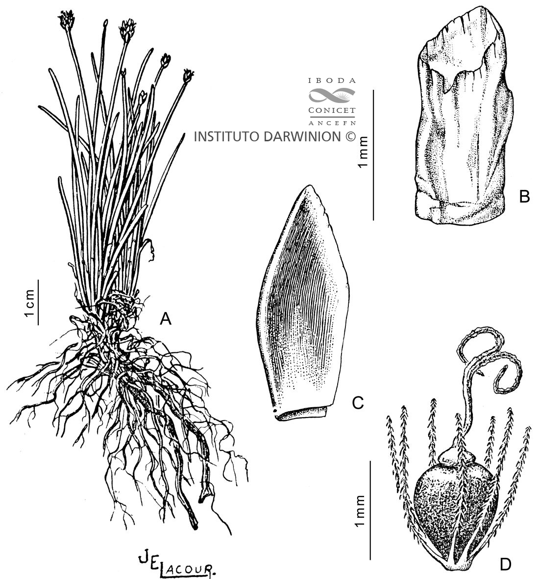 Rizoma estolonífero; vaina superior rojiza, boca prolongada por una porción blanca, arrugada, escariosa. Espiguilla castaña, de 6-7 mm; glumas de ápice obtuso, de carena amarillo-verdosa, castañas a los lados. Estambres 3. Estilo bífido. Aquenio obovoide, biconvexo de bordes obtusos, castaño oscuro, lustroso, de 1-1,2 mm, sin el rostro; setas hipóginas 7, amarillentas, del largo del aquenio, o algo más; rostro deprimido, pardusco.