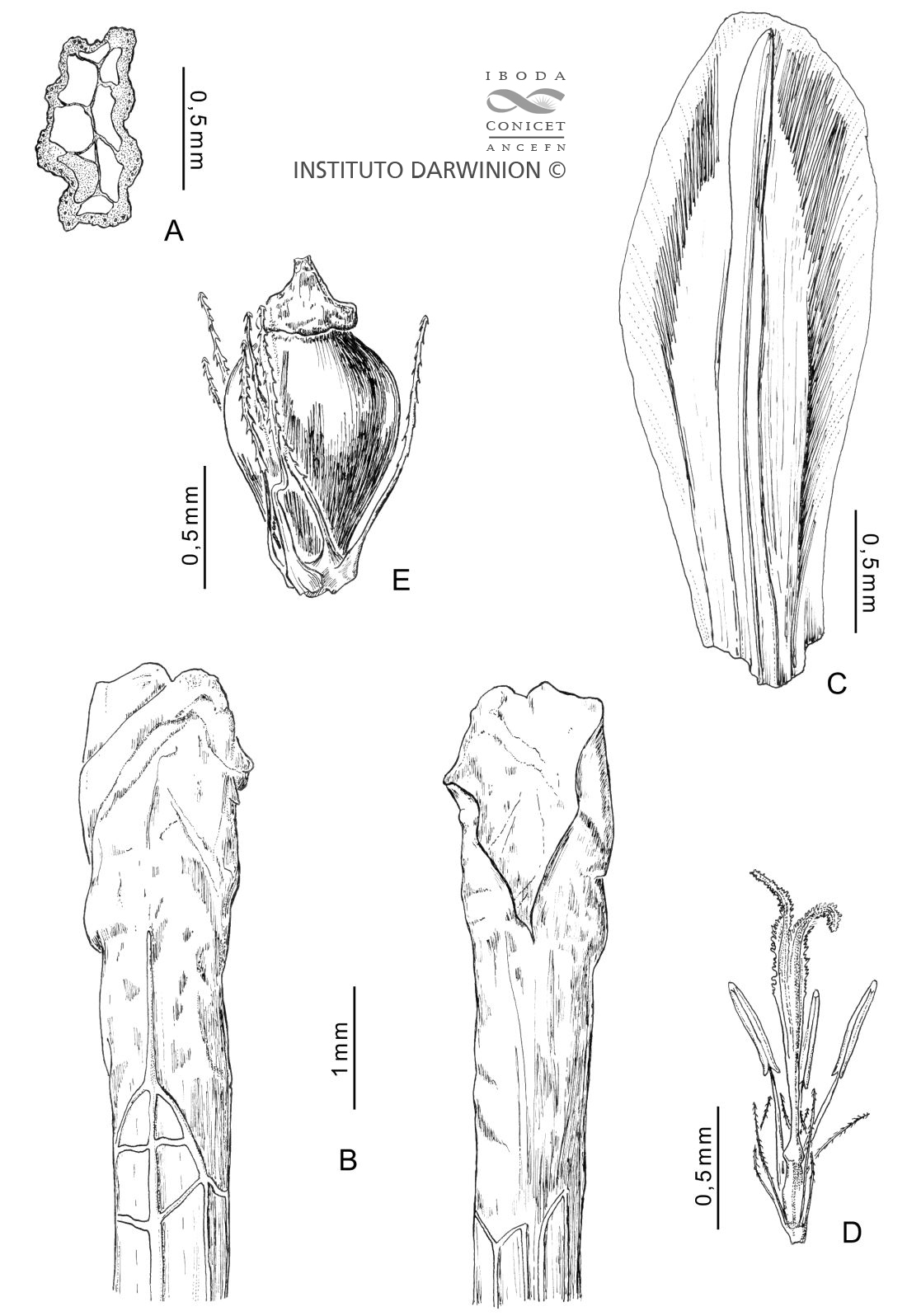 Rizoma estolonífero; vaina superior rojiza, boca prolongada por una porción blanca, arrugada, escariosa. Espiguilla castaña, de 6-7 mm; glumas de ápice obtuso, de carena amarillo-verdosa, castañas a los lados. Estambres 3. Estilo bífido. Aquenio obovoide, biconvexo de bordes obtusos, castaño oscuro, lustroso, de 1-1,2 mm, sin el rostro; setas hipóginas 7, amarillentas, del largo del aquenio, o algo más; rostro deprimido, pardusco.
