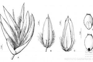 Plantas cespitosas, macolladas, perennes, de 30-45 cm de alto; cañas 1-nodes; nudos castaño-oscuro; vainas glabras, las basales lustrosas; lígulas pestañosas; láminas linea¬res, acuminadas, glabras, plegadas o subconvolutadas, de 10-15 x 1-2 cm. Inflorescencia en panoja erecta, linear, contraída, subespiciforme, llevando por lo general 25-35 espiguillas; raquis triquetro, flexuoso, glabro, ca. 10 cm de largo; ramas la¬terales cortas, pauciespiculadas, las inferiores de 2-3 cm de largo. Espiguillas 6-8-floras, de 1 cm de largo, brevemente pediceladas, blanquecinas o violáceas; glumas aquilladas, agudas, 1-nervias, membranáceas, la inferior de 4 mm de largo, la superior algo mayor; callo pestañoso; lemma de 5-5,5 mm de largo, lanceolada, 3-nervia, 3-dentada, 3-aristulada, la mediana, mayor, apenas alcanza los 0,5 mm de largo; nervaduras pestañosas en la ½ basal (en las marginales) o el ? basal en la mediana, pelos tiesos y divergentes; pálea lanceolada, glabra, bidentada, algo menor que la lemma, ensanchada en su ? inferior; flores cleistógamas; anteras de 0,75 mm de largo; cariopsis lanceolado-elíptica, plano-convexa, de 1,5-2 mm de largo.