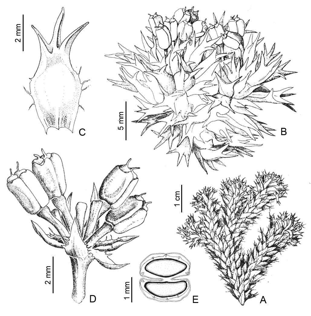A. Fragmento del cojín. B. Detalle de una roseta. C. Hoja. D. Umbela fructífera. E. Fruto, corte transversal.