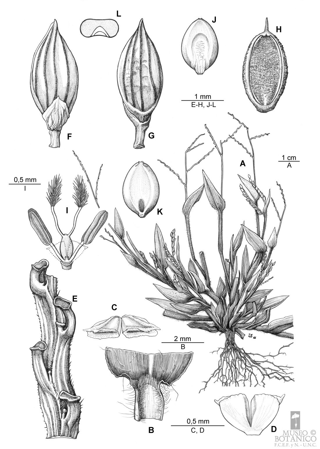 A. Planta. B. Región ligular. C, D. Lodículas. E. Porción de un raquis de la inflorescencia. F. Espiguilla vista ventral. G. Espiguilla vista dorsal. H. Antecio superior vista ventral. I. Flor perfecta. J. Cariopsis vista escutelar. K. Cariopsis vista hilar. L. Cariopsis, transcorte.