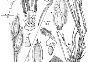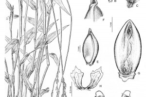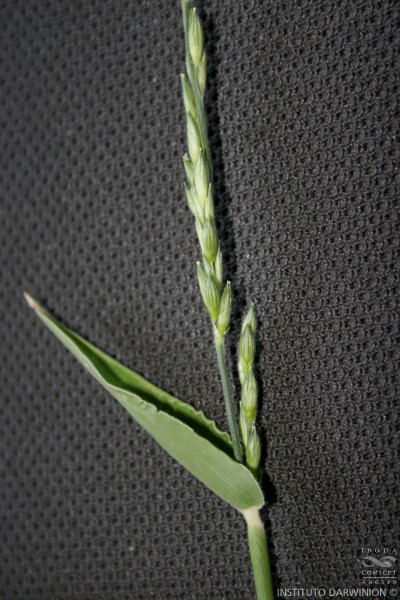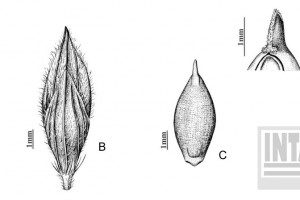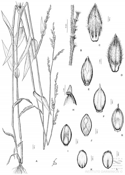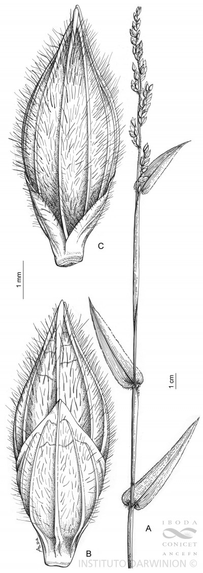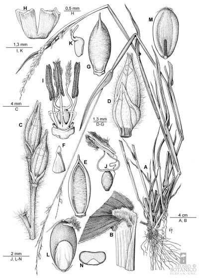Plantas anuales de 30-80 cm de alto; cañas erguidas a geniculadas, arraigadas y ramificadas en los nudos basales; entrenudos de 5-9 cm de largo, cortamente pubescentes hacia el ápice; nudos pubescentes, comprimidos; vainas de 3-8 cm de largo, estriadas, hirsutas a ralamente pilosas, de márgenes membranáceos; lígulas de base cortamente membranácea, luego largamente pestañosas, hasta de 2 mm de largo, subrectas; cuello pubérulo a densamente viloso; láminas lanceoladas, de 5-8,5 cm x 7-13 mm, glabrescentes a cortamente híspidas en ambas caras, base cordada, ápice agudo, márgenes cartilaginosos, ondulados, escabrosos, pestañosos hacia los bordes basales. Inflorescencias largamente elipsoidales, radiadas, estrechas, exertas o parcialmente incluidas en las vainas foliares, de 5-14 cm x 6-10 mm, terminales, paucifloras; eje principal anguloso, cortamente hirsuto, con 4-6 ramificaciones racemosas de primer orden, adpresas o poco divergentes; raquis de las ramificaciones de 2-5 cm x 0,4-0,7 mm, triquetro, hirsuto, terminando en una espiguilla desarrollada; ramificaciones secundarias presentes; pedicelos triquetros, de 0,5-2,5 mm de largo, solitarios o en pares, desiguales en longitud, pubescentes, terminando con un anillo de pelos tiesos por debajo de la inserción de la espiguilla; espiguillas dispuestas en 2-4 series sobre dos lados del raquis, solitarias hacia el ápice de los racimos, el resto en pares. Espiguillas largamente elipsoidales, de 6,2-8 x 1,8-2,4 mm, pubescentes, de ápice agudo y base atenuada; gluma superior y lemma inferior subiguales, nervios conspicuos, con vénulas transversales junto al ápice; gluma inferior ovado-acuminada, de 3-4,5 mm de largo, ½ del largo de la espiguilla, adaxial y abaxial, membranácea, esparcidamente pubescente, abrazadora, 7-nervia; gluma superior de 4,8-6 mm de largo, membranácea, pubescente, 7-nervia; lemma inferior de 5,1-6 mm de largo, membranácea, pubescente hacia la porción apical, 5-nervia; pálea inferior de 3,6-4,8 x 1,5-1,8 mm, lanceolada, hialina, glabra, 2-nervia; flor inferior ausente o estaminada; lodículas 2; estambres, cuando presentes 3, anteras ca. 2 mm de largo; antecio superior largamente elipsoide, de 4,5-5,4 x 1,8-2,1 mm, crestado, plano-convexo, pajizo, endurecido, transversalmente rugoso; lemma de ápice crestado, comprimido lateralmente hasta de 1 mm de largo; pálea biaquillada, de bordes involutos, lisos y lustrosos, el resto de la superficie rugosa; lodículas 2; estambres 3, anteras ca. 1,2 mm de largo; cariopsis ca. 3,3 x 2,1 mm, ovoide; hilo linear, hasta ½ del largo total, sub-basal; embrión ¾ o menos del largo de la cariopsis.