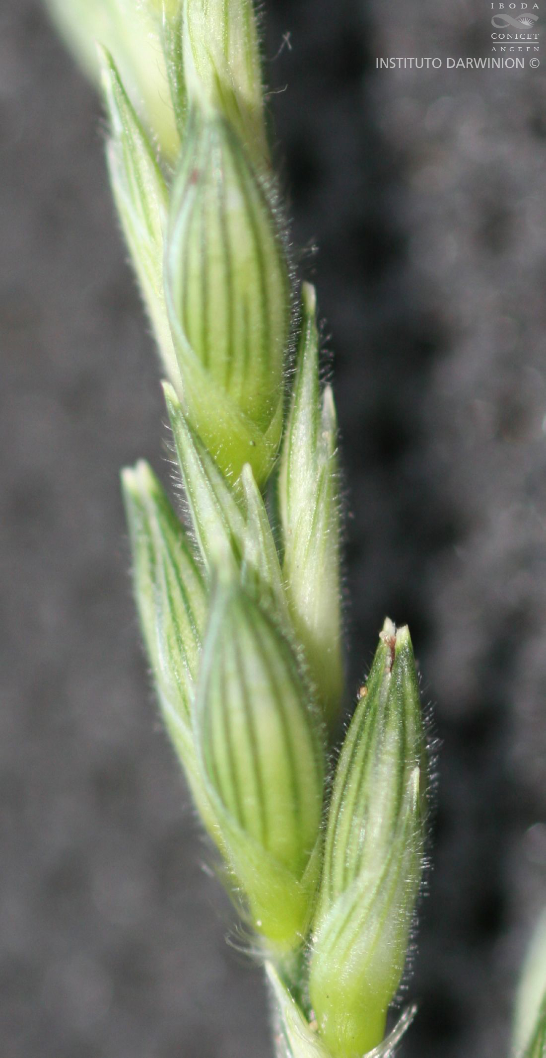 Plantas anuales de 30-80 cm de alto; cañas erguidas a geniculadas, arraigadas y ramificadas en los nudos basales; entrenudos de 5-9 cm de largo, cortamente pubescentes hacia el ápice; nudos pubescentes, comprimidos; vainas de 3-8 cm de largo, estriadas, hirsutas a ralamente pilosas, de márgenes membranáceos; lígulas de base cortamente membranácea, luego largamente pestañosas, hasta de 2 mm de largo, subrectas; cuello pubérulo a densamente viloso; láminas lanceoladas, de 5-8,5 cm x 7-13 mm, glabrescentes a cortamente híspidas en ambas caras, base cordada, ápice agudo, márgenes cartilaginosos, ondulados, escabrosos, pestañosos hacia los bordes basales. Inflorescencias largamente elipsoidales, radiadas, estrechas, exertas o parcialmente incluidas en las vainas foliares, de 5-14 cm x 6-10 mm, terminales, paucifloras; eje principal anguloso, cortamente hirsuto, con 4-6 ramificaciones racemosas de primer orden, adpresas o poco divergentes; raquis de las ramificaciones de 2-5 cm x 0,4-0,7 mm, triquetro, hirsuto, terminando en una espiguilla desarrollada; ramificaciones secundarias presentes; pedicelos triquetros, de 0,5-2,5 mm de largo, solitarios o en pares, desiguales en longitud, pubescentes, terminando con un anillo de pelos tiesos por debajo de la inserción de la espiguilla; espiguillas dispuestas en 2-4 series sobre dos lados del raquis, solitarias hacia el ápice de los racimos, el resto en pares. Espiguillas largamente elipsoidales, de 6,2-8 x 1,8-2,4 mm, pubescentes, de ápice agudo y base atenuada; gluma superior y lemma inferior subiguales, nervios conspicuos, con vénulas transversales junto al ápice; gluma inferior ovado-acuminada, de 3-4,5 mm de largo, ½ del largo de la espiguilla, adaxial y abaxial, membranácea, esparcidamente pubescente, abrazadora, 7-nervia; gluma superior de 4,8-6 mm de largo, membranácea, pubescente, 7-nervia; lemma inferior de 5,1-6 mm de largo, membranácea, pubescente hacia la porción apical, 5-nervia; pálea inferior de 3,6-4,8 x 1,5-1,8 mm, lanceolada, hialina, glabra, 2-nervia; flor inferior ausente o estaminada; lodículas 2; estambres, cuando presentes 3, anteras ca. 2 mm de largo; antecio superior largamente elipsoide, de 4,5-5,4 x 1,8-2,1 mm, crestado, plano-convexo, pajizo, endurecido, transversalmente rugoso; lemma de ápice crestado, comprimido lateralmente hasta de 1 mm de largo; pálea biaquillada, de bordes involutos, lisos y lustrosos, el resto de la superficie rugosa; lodículas 2; estambres 3, anteras ca. 1,2 mm de largo; cariopsis ca. 3,3 x 2,1 mm, ovoide; hilo linear, hasta ½ del largo total, sub-basal; embrión ¾ o menos del largo de la cariopsis.