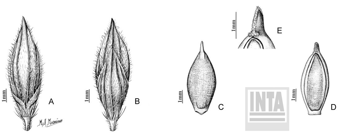 A,B. espiguilla, C.D. antecio, E. ápice de la lemma.