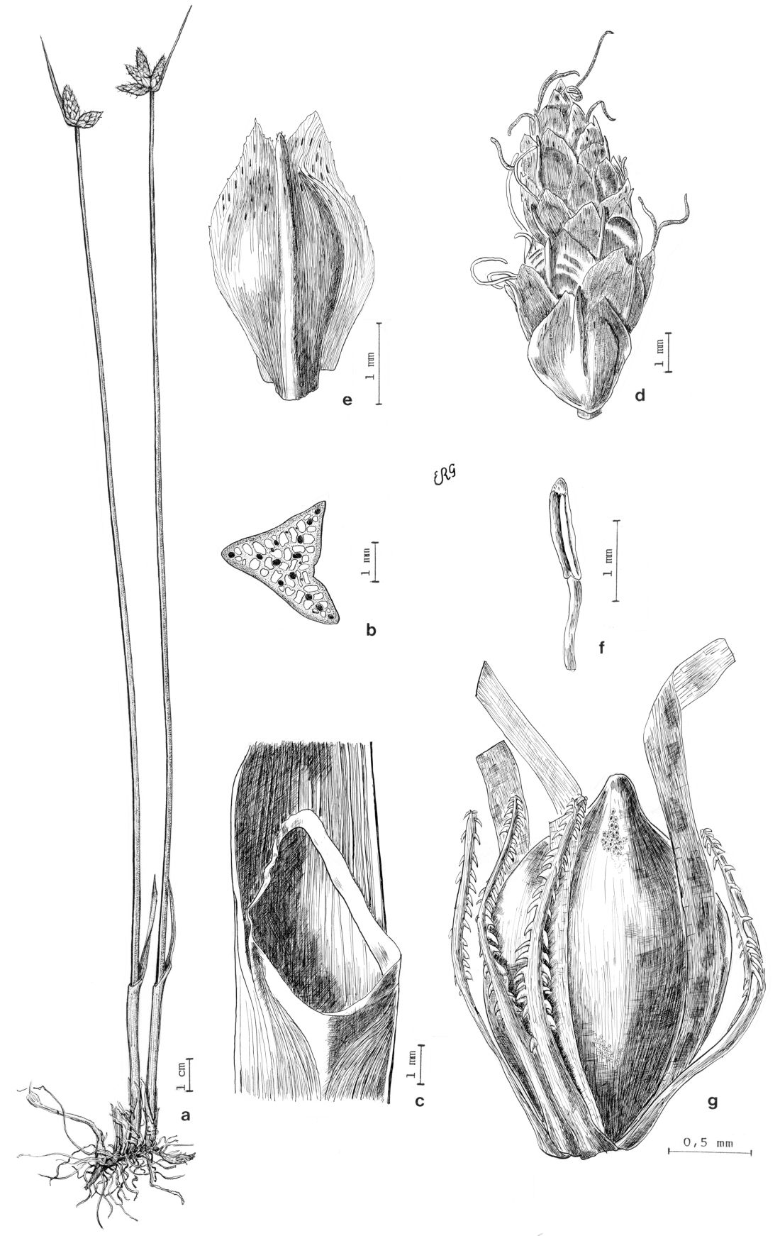 A. Planta. B. Transección del tallo. C. Base de la lámina foliar y lígula. D. Espiguilla. E. F. Estambre. G. Aquenio con cerdas persistentes y filamentos estaminales acrescentes.