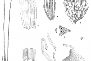 A. Planta. B. Transección del tallo. C. Base de la lámina con lígula y vaina foliar. D. Espiguilla. E. Gluma. F. Flor. G. Aquenio con cerdas y filamentos estaminales acrescentes.