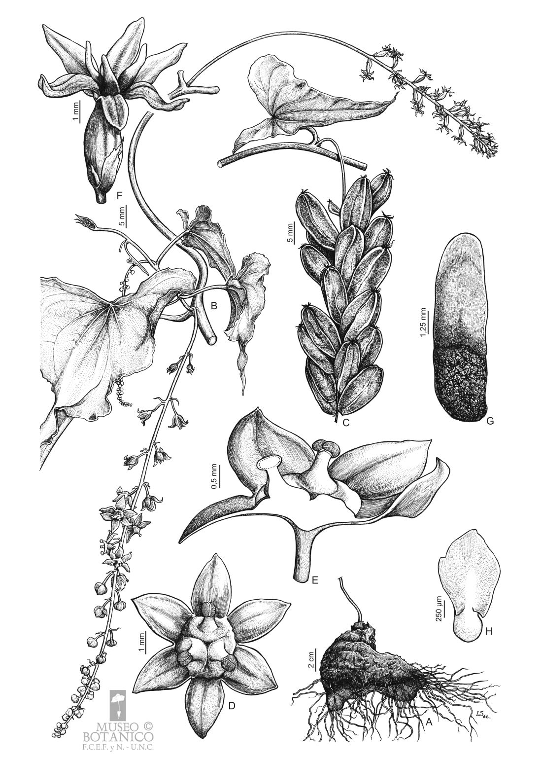 . A. Tubérculo. B. Rama florífera. C. Rama fructífera. D. Flor masculina, vista superior. E. Corte longitudinal por flor masculina. F. Flor femenina. G. Semilla, vista lateral. H. Embrión.