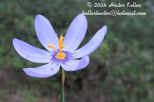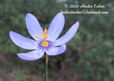 Planta grácil de 25-40 cm de altura. Bulbo subgloboso, de 12-16 mm de diámetro; túnicas externas pardo-oscuras. Hojas basales de 10-13 × 0,15-0,3 cm, a veces ausentes. Eje de la inflorescencia endeble, flexuoso, con una hoja cerca de la base y 1-2 brácteas hacia el ápice. Espatas 2-4, pedunculadas, bifloras.Flor de color azul pálido hasta casi blanca, raro blanca de 4,4-5,5 cm de diámetro. Tépalos de 18,5-26 × 8-11 mm, lanceolados, con pequeñas estrías que rodean una mancha amarilla basal. Filamentos de 1,8-2,8 mm de largo, libres, filiformes, amarillento-verdosos. Anteras de 5-6 mm de largo, amarillas, muy retorcidas o incurvas luego de la dehiscencia. Ovario de 3,5 × 1,4-1,5 mm, claviforme. Estilo 3,4-3,7 mm de largo, ramas del estilo extendidas hacia arriba, amarillento-verdosas salvo el ápice azul-violáceo, de 2,9-3,9 mm de largo; área estigmática en forma de un embudo diminuto, emarginado, azul-violáceo. Cápsula de 7-10 × 4-6 mm clavifome o turbinada, cortamente trivalvada. Semillas pequeñas, angulosas, pardas.