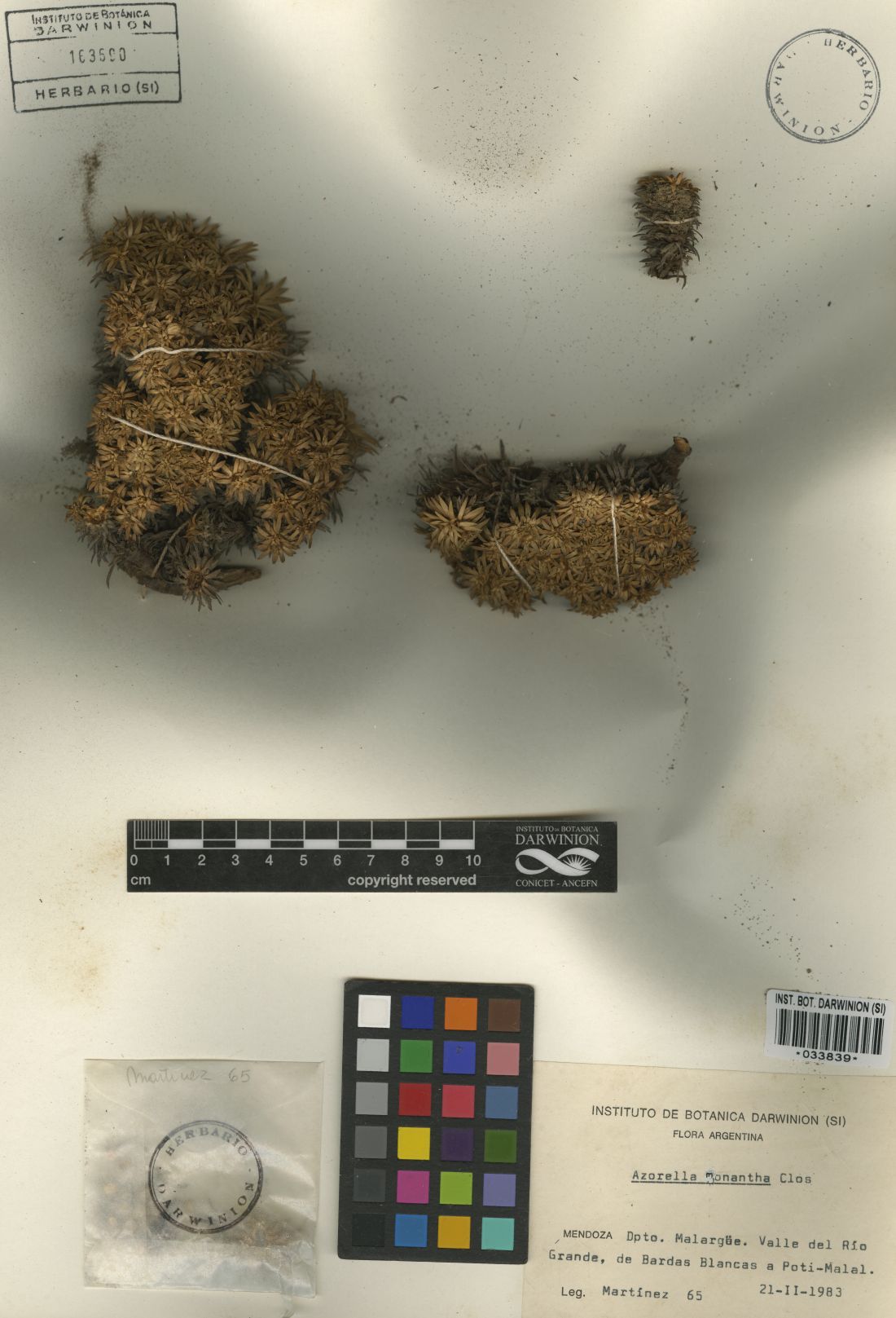 Subarbustos formando cojines compactos, chatos o hemisféricos; ramas cubiertas por las bases foliares persistentes. Hojas arrosetadas en el extremo de las ramas, sésiles o subsésiles, de 3-15(-20) × 1-2(-3) mm, crasas, coriáceas; lámina linear u oblonga, entera, plana, glabra o pubescente en la cara adaxial y en los márgenes, ápice agudo a obtuso, mucronado, punzante; base foliar más ancha que la lámina, membranácea, ciliada en los márgenes, sin estípulas. Umbelas 1-5-floras, perfectas, sésiles; involucro de brácteas generalmente en igual número que las flores, de 0,5 a 3 mm de largo, con abundantes cilias en los márgenes y en la base, libres. Flores blanco-amarillentas; cáliz de dientes apenas insinuados; pétalos oblongo-lanceolados a obovados, de 1,5-2,5 mm de largo; pedicelos más cortos que las brácteas involucrales, glabros. Frutos ápteros, ovoides, obovoides o prismáticos, de 3,5-5,5 × 2,5-4,5 mm; canales secretores pequeños, poco evidentes. Carpóforo ausente.