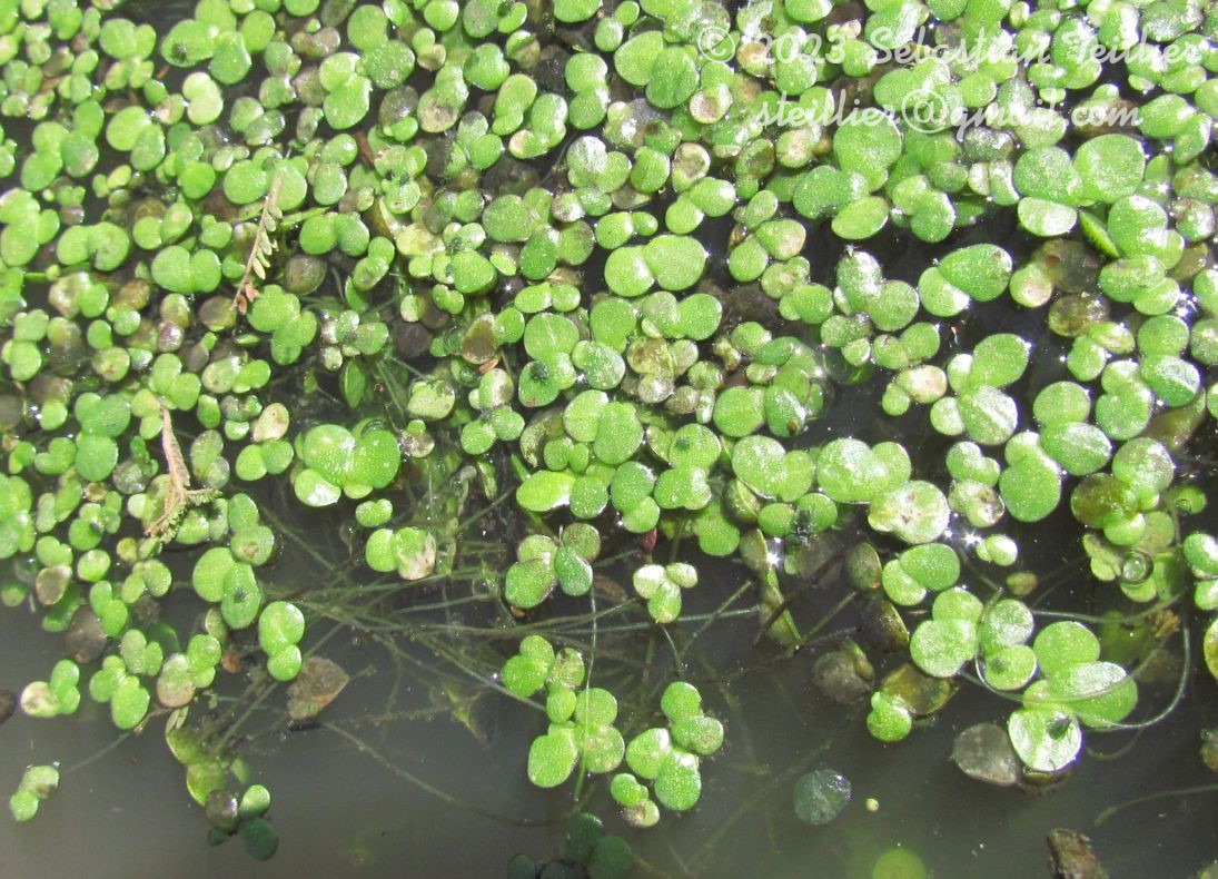 Fronde flotante, poco o muy asimétrica, orbicular a obovada o casi romboidal con los ángulos obtusos, de 3,2-6 x 2,4-4,5 mm; cara superior ligeramente aquillada en la línea media, cara inferior notablemente gibosa, el espesor alcanza hasta 4 mm en la parte media debido a la presencia de lagunas aerénquimáticas muy grandes, con un nervio mediano y dos laterales poco visibles a causa del espesor de la fronde. Generalmente adheridas por corto estipe de a 3, menos frecuentemente de 2-4 o solitarias. Raíz muy larga, hasta de 6 cm. Pilorriza, cilíndrica, de punta roma, derecha o poco curvada, larga, de 2,5-5 mm. Vaina de la raíz no alada. Espata cerrada en forma de tubo, con estrecha abertura superior que es desgarrada irregularmente por las flores. Estambre con filamento arqueado, de 1,4 mm; tecas de 0,25 mm de diámetro; polen globoso, de 25 µm de diámetro, con espínulas de 1 µm. Pistilo lageniforme, de 1,5-1,8 mm; ovario comprimido dorsiventralmente, con 2-7 óvulos anátropos, que miden 0,25 x 0,15-0,18 mm; estilo largo y curvado; estigma circular, cóncavo y pigmentado. Fruto simétrico, casi esférico, de 1,5 mm de diámetro, con el diámetro longitudinal ligeramente mayor que el transversal, comprimido dorsiventralmente, alado, con estilo persistente muy corto; semillas 2-6 erguidas, excepcionalmente 1, y entonces, inclinada; testa gruesa, con costillas anchas y prominentes, separadas por surcos angostos. — Al llegar el invierno algunas plantas producen, en lugar de los brotes normales, 1 ó 2 brotes muy chicos, de alrededor de 1,5 mm de diámetro, algo gruesos pero no gibosos, sin raíz; caen al fondo del pantano o laguna y allí permanecen durante la época de frío para volver a la superficie y dar origen a nuevas plantas en la primavera.