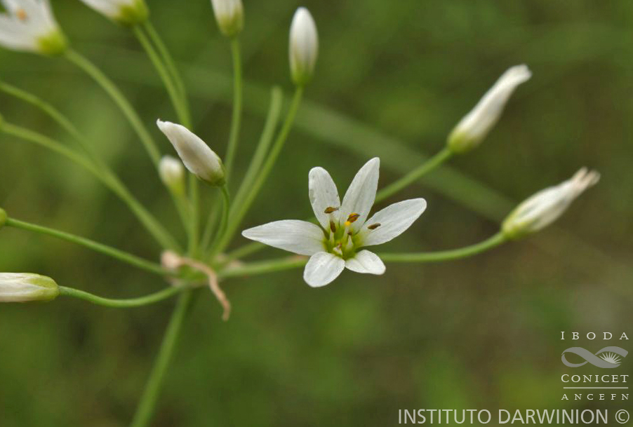 Hierba, 22,5-48 cm altura, bulbo generalmente cónico, 15-32 x 7-18 mm, simple o con escasos bulbillos a veces incluídos en la vaina exterior carnosa del bulbo. Vaina foliar 2-10 cm de largo, subterránea, sin lígula; lámina fláccida, verde oscuro a veces glauca, base rojiza, linear, sub-carenada, borde liso, aguda, 15-29(-40) cm x 0,7-3 mm. Escapos 1-4, subcilíndricos, en general más altos que las hojas, 13,5-40 cm de largo, ligeramente rojizos en su base; umbela con 8-27 flores; brácteas 2, rara vez 3, libres o apenas soldadas en su base, ovado-triangulares, agudas, 14-29 mm de largo. Perigonio cupuliforme, tépalos apenas soldados en su base, lanceolados, blancos lineado-violáceos, 7-10 x 2-2,8 mm; estambres 5,5-8,5 mm de largo, filamentos lanceolado-subulados aplanados en la base y filiformes hacia el ápice, concrescentes, en su base, anteras castañas, de 1,9-2,5 mm de largo. Ovario oblongo-elipsoidal, linear, 1,5-2 mm de largo; óvulos 3-5(-7) por lóculo; estilo 3-4,5 mm de largo, igual o algo más corto que los estambres. Cápsula globosa, 5-5,5 mm diám.; semillas 1,8-2,5 mm diám., aparentemente sin poliembrionía. Cromosomas: 2n =10 (Crosa, 1972; Souza et al. 2009).