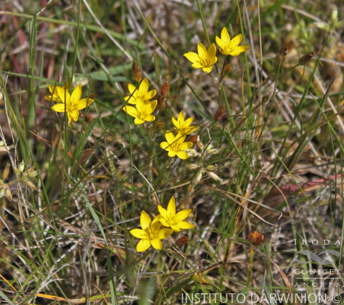 Hierba 4,5-35 cm de altura, bulbo sub-globoso, 5-18 mm diám., simple o con escasos bulbillos, sin rizomas laterales. Vaina foliar 0,5-7 cm de largo, lígula inconspicua, a veces ausente; lámina foliar canaliculada, estrechamente linear, 4-27 cm x 0,5-3,5 mm, borde ligeramente papiloso, aguda, erguida, verde oscuro. Escapos 1-7, subcilíndricos, 2,3-24 cm de largo, en general más largos que las hojas. Umbela 2-6(-12)-flora, rara vez uniflora; brácteas oval-lanceoladas, 6,5-20 mm de largo; pedicelos erectos, sub-iguales entre sí, 6-50 mm de largo. Perigonio rotáceo, tépalos apenas concrescentes entre sí en la base, lanceolados, elípticos u oval-lanceolados, amarillos con nervio medio violáceo, verdoso o castaño; de 5-10,5 x 1,5-4 mm. Filamentos estaminales subulados, los externos algo más angostos y cortos que los interiores, soldados independientemente a la base de los tépalos, de 0,2-0,5 mm lat.; anteras estrechamente oblongas, tecas divergentes y agudas en la base, 1,5- 4 mm de largo. Ovario elipsoidal, a veces obovoide, 1,5-2,8 mm de largo; óvulos 5-12(-18) por lóculo; estilo 2-4 mm de largo. Cápsula sub-globosa, 3-6 mm diám.; semillas 1,5-2,1 mm diám. Cromosomas 2n = 8, 10, 16, 34, 32 (Crosa, 1972; Nuñez, 1972; Montes & Nuciari,1987).