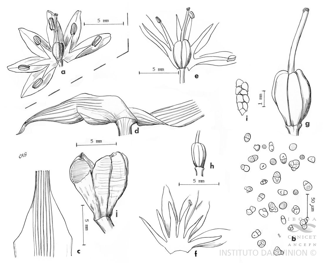 Hierba de 16-70 cm de altura, bulbo sub-globoso a veces ligeramente conoide, de 10-23 mm de long. con disco muy desarrollado; numerosos bulbillos, sin rizomas laterales. Vaina foliar de 1,2-17 cm de largo, eligulada; lámina foliar plana, con surco medio abaxial marcado, verde-glauca, de borde liso, obtusa, sub-erguida, 12-56 cm x 2-10 mm. Escapos 1-4, subcilíndricos, 11-69 cm de largo; umbela 4-18(-24)-flora; pedicelos de 10 28 mm de largo; brácteas ovado-triangulares, agudas, de 10-15 mm de largo, concrescentes en la base. Perigonio cupuliforme, semipatente, de 13-15 mm diám.; tépalos apenas concrescentes en la base, ovales, elípticos o lanceolados, blanco níveo, lineado-violáceo o rosado, verdosos en la base, 6-9,5 x 2-2,7 mm. Estambres de 4,5-6 x 1,3 mm, algo más anchos los correspondientes a los tépalos internos, filamentos planos, lanceolado subulados, dilatados hacia la base y allí connados aproximadamente 1 mm, sub-erguidos en la antesis; anteras 1,5-2,5 mm de largo; castañas. Ovario obovoide, a veces ligeramente adelgazado en la base, de 2-3 mm de largo; 5-9 óvulos por lóculo; estilo de 3-4,5 mm de largo, de igual altura o sobrepasando a los estambres. Cápsula globosa obovoide, de 4,5-6 mm diám.; semillas de 3 x 2 mm, a menudo con varios embriones. Cromosomas: 2n =10, 18, 19 (Nuñez et al., 1972; Souza et al., 2012).