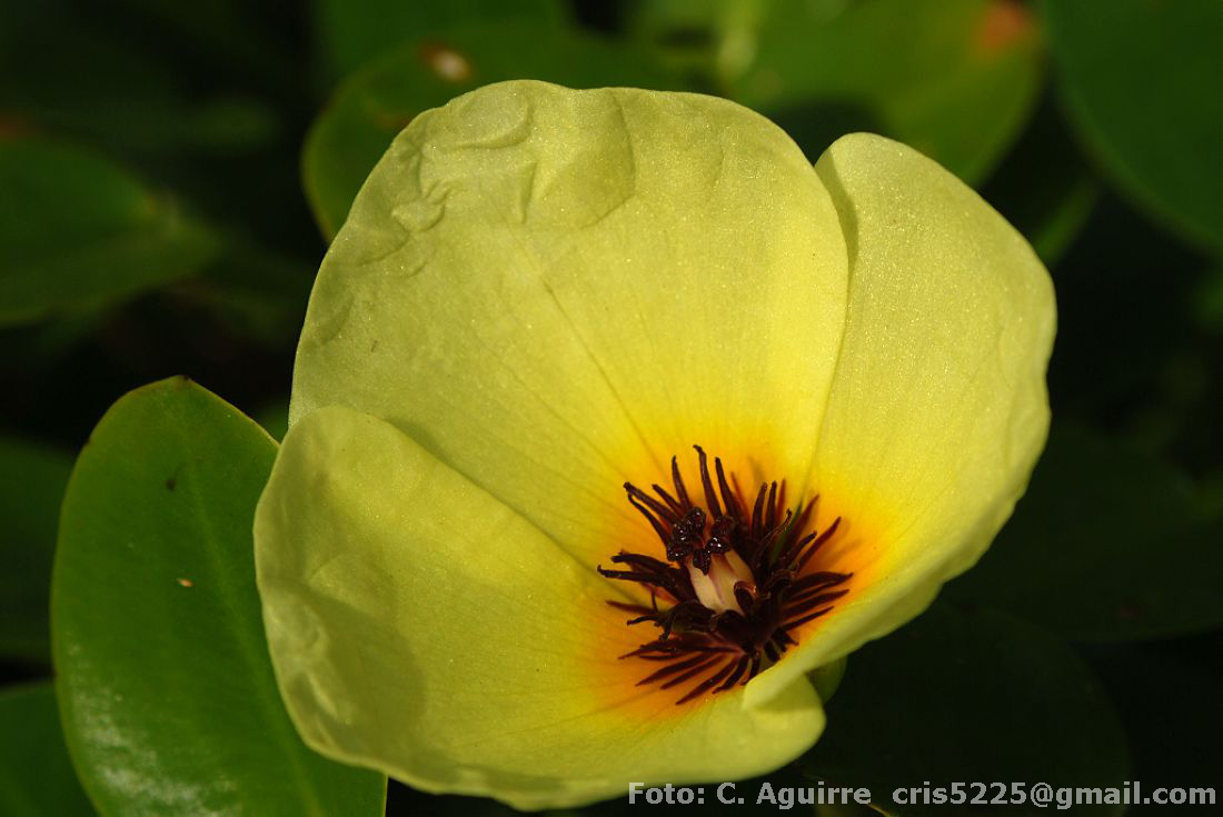 Perenne, acuática, de hojas las primeras sumergidas, reducidas a folíolos lineares, las restantes con pecíolo cilíndrico, de 10-40 cm de largo, de base brevemente envainadora, y lámina flotante, anchamente aovada hasta suborbicular, levemente acorazonada en la base y ápice obtuso, hasta 10 cm de largo, 7-9-nervada; escapo aproximadamente igualando a los pecíolos, seudo-umbelas con 2-4 flores, a veces alguna umbélula secundaria y casi siempre 1 ó 2 brotes vegetativos; brácteas de 15-40 mm de largo, aovadas, agudas; pedicelos de 10-20 cm, flores durante la antesis emergentes del agua, grandes y vistosas, sépalos ca. 25 mm de largo verdes, aovados, obtusos, coriáceos; pétalos hasta 50 mm de largo suborbiculares, superando ampliamente los sépalos, amarillentos, muy fugaces, estambres cerca de 20 a 40 (los exteriores, ca. 20 a veces estériles), filamentos de los estambres fértiles ca. 8 mm de largo, rojo-purpúreos, anteras amarillas, lineales; gineceo compuesto de 4-8 carpelos, ca. 13 mm de largo, atenuados en estilos, con estigmas poco dilatados, papilosos. Cápsulas maduras ca. 15 mm de largo, elipsoides, rostradas; semillas numerosas.