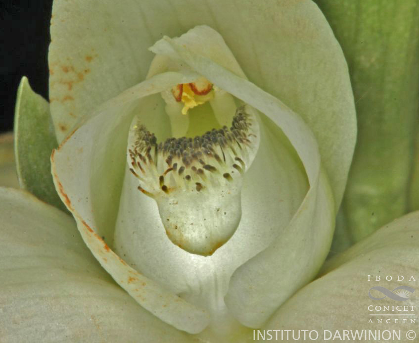 Planta 40-70 cm de altura, robusta, erguida. Hojas 10-24 × 2-3 cm, lanceoladas, las basales marchitas en la antesis, hojas caulinares pocas a lo largo del escapo. Inflorescencia subdensa, de ± 20 flores blancas, membranáceas. Sépalos 16-20 × 7-8 mm, ovado-oblongos, subagudos, 7-nervados, el dorsal ligeramente cóncavo. Pétalos 15-18 × 9-11 mm, anchamente ovado-oblongos, asimétricos, con 7 nervios; labelo 13-15 × 7-9 mm, anchamente unguiculado, uña carnosa en la base, apenas trilobado, 5-nervado, cubierto de apéndices capitados cilíndricos, con cabezuelas de color que varían del castaño oscuro al grisáceo-negruzco, lóbulos laterales redondeados, cortamente papilosos; ápice del labelo obtuso y desnudo. Columna 10 mm de largo, con ala recta, angosta, estrechada y engrosada en la parte superior, formando un todo con la parte superior lateral del estigma; estigma angostamente elíptico, ocupando 2/3 de la columna.