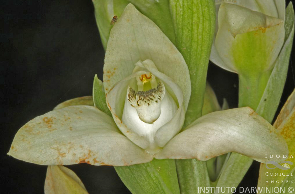 Planta 40-70 cm de altura, robusta, erguida. Hojas 10-24 × 2-3 cm, lanceoladas, las basales marchitas en la antesis, hojas caulinares pocas a lo largo del escapo. Inflorescencia subdensa, de ± 20 flores blancas, membranáceas. Sépalos 16-20 × 7-8 mm, ovado-oblongos, subagudos, 7-nervados, el dorsal ligeramente cóncavo. Pétalos 15-18 × 9-11 mm, anchamente ovado-oblongos, asimétricos, con 7 nervios; labelo 13-15 × 7-9 mm, anchamente unguiculado, uña carnosa en la base, apenas trilobado, 5-nervado, cubierto de apéndices capitados cilíndricos, con cabezuelas de color que varían del castaño oscuro al grisáceo-negruzco, lóbulos laterales redondeados, cortamente papilosos; ápice del labelo obtuso y desnudo. Columna 10 mm de largo, con ala recta, angosta, estrechada y engrosada en la parte superior, formando un todo con la parte superior lateral del estigma; estigma angostamente elíptico, ocupando 2/3 de la columna.