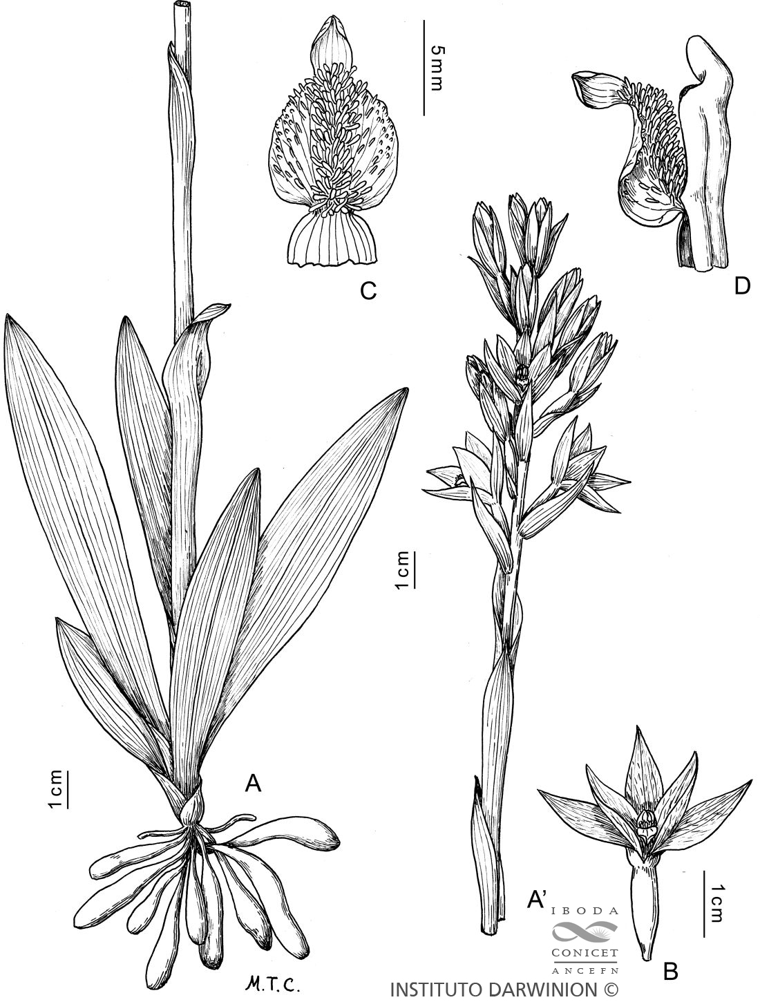 Planta 40-70 cm de altura, robusta, erguida. Hojas 10-24 × 2-3 cm, lanceoladas, las basales marchitas en la antesis, hojas caulinares pocas a lo largo del escapo. Inflorescencia subdensa, de ± 20 flores blancas, membranáceas. Sépalos 16-20 × 7-8 mm, ovado-oblongos, subagudos, 7-nervados, el dorsal ligeramente cóncavo. Pétalos 15-18 × 9-11 mm, anchamente ovado-oblongos, asimétricos, con 7 nervios; labelo 13-15 × 7-9 mm, anchamente unguiculado, uña carnosa en la base, apenas trilobado, 5-nervado, cubierto de apéndices capitados cilíndricos, con cabezuelas de color que varían del castaño oscuro al grisáceo-negruzco, lóbulos laterales redondeados, cortamente papilosos; ápice del labelo obtuso y desnudo. Columna 10 mm de largo, con ala recta, angosta, estrechada y engrosada en la parte superior, formando un todo con la parte superior lateral del estigma; estigma angostamente elíptico, ocupando 2/3 de la columna.