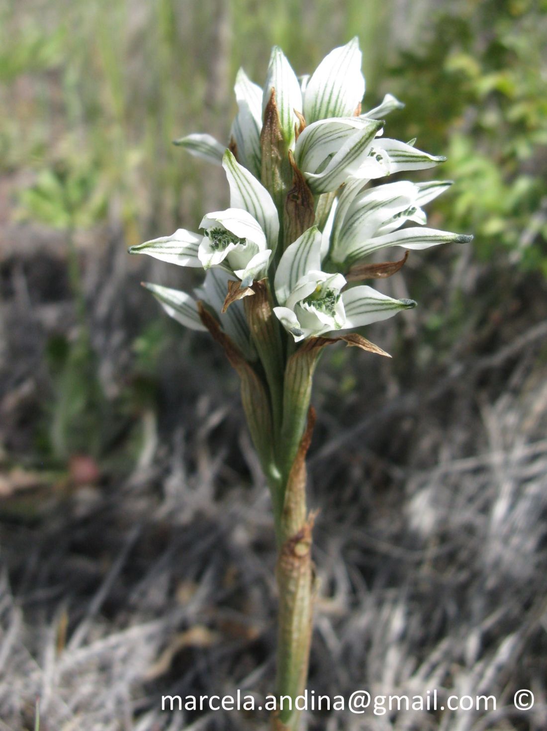 Planta de 18-30 cm de altura. Hojas de 4-8 X 1,2-1,5 cm, lanceoladas, atenuadas en seudopecíolo, hojas caulinares angostas, con ápice castaño. Inflorescencia en espiga triangular, corta, pauciflora (8-15 flores), abriéndose poco durante la floración. Flor pequeña, blanco-amarillenta, con nervadura verde oscuro. Sépalos membranáceos de 15-17 X ± 4 mm, 3-nervados, el dorsal lanceolado, los laterales ligeramente arqueados, con ápice, a veces, carnoso. Pétalos oblongos, obtusos o acuminados de 13-14 X 3-3,5 mm, 3-nervados. Labelo de 11-12 X 5-6 mm, trilobado, largamente unguiculado; lóbulo central lanceolado, acuminado, recorrido por 5 nervios cubiertos de laminillas membranáceas, falcadas, con el ápice engrosado y oscuro; lóbulos laterales obtusos recorridos por nervios oblicuos provistos de algunas laminillas o engrosamientos; ápice del labelo desnudo y membranáceo. Columna corta, de 8 mm, con ala recta.