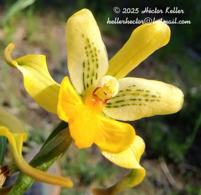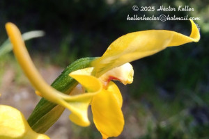 Herbácea, de 50-80 cm de altura. Hojas de 10-13 cm, lanceoladas. Brácteas agudas más cortas que las flores. Sépalo dorsal de 12 X 5-6 mm algo cóncavo, acuminado; sépalos laterales de 20-22 X 5-6 mm con nervios longitudinales ligeramente engrosados en la base, lanceolados, con caudículas carnosas, delgadas, ± de 9 mm. Pétalos de 10-11 X 1-6 mm, obovados, obtusos, con nervios longitudinales ramificados y algo engrosados en la base. Labelo de 6-8 X 10-15 mm, trilobado, amarillo; lóbulos laterales redondeados y con nervios oblicuos, engrosados, prominentes, de color verde; lóbulo central de ápice redondeado, obtuso, con nervios longitudinales cubiertos de verrugas carnosas, de color naranja. Columna de 5 mm con 2 repliegues carnosos, de color rojo oscuro, en la unión con el labelo, que contrastan con el blanco puro de la columna. Ovario torcido, geniculado.