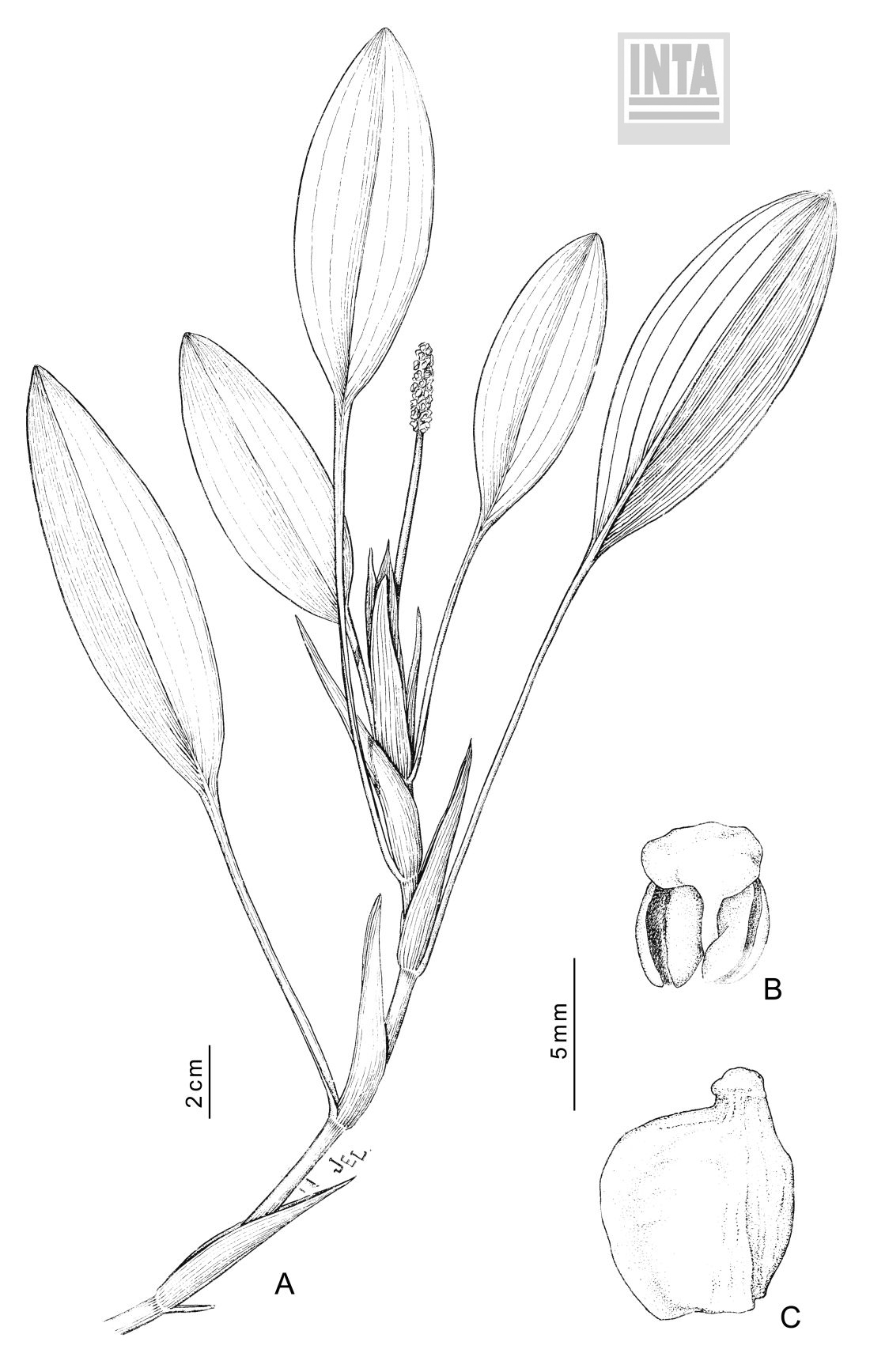 Plantas mayores de 50 cm de largo. Tallos cilíndricos, hasta de 3 mm diám., entrenudos de 4-15 cm de largo, bien marcados. Hojas dimorfas, las flotantes pecioladas, lámina de 5-8 (-12) × 1,5-3,5 cm, angostamente elípticas o elípticas, coriáceas, con (15)-17-21 nervios bien marcados en el envés, pecíolos de igual longitud o más largos que las láminas; estípulas membranáceas de 4-6,5 cm de largo, con carena bien marcada, especialmente en la base. Hojas sumergidas de 15-24 × 1,5-4 cm, cortamente pecioladas o sésiles, angostamente elípticas, membranáceas, translúcidas, 9-15-nervias, con tabiques transversales visibles por transparencia, rápidamente senescentes, en general ausentes en los ejemplares de herbario. Pedúnculos de igual o mayor diámetro que el tallo, de 4-6 cm de largo. Espigas densas de (1,7)-2-4 (-6) cm de largo. Estigmas conspicuos, oblongos, no cubriendo totalmente al estilo curvado y con la parte dorsal libre, en forma de pico. Fructificación abundante. Frutos secos de 3,5-3,8 × 2,3-3 mm lados planos y con protuberancias poco marcadas, carena dorsal muy marcada y rostro notable.