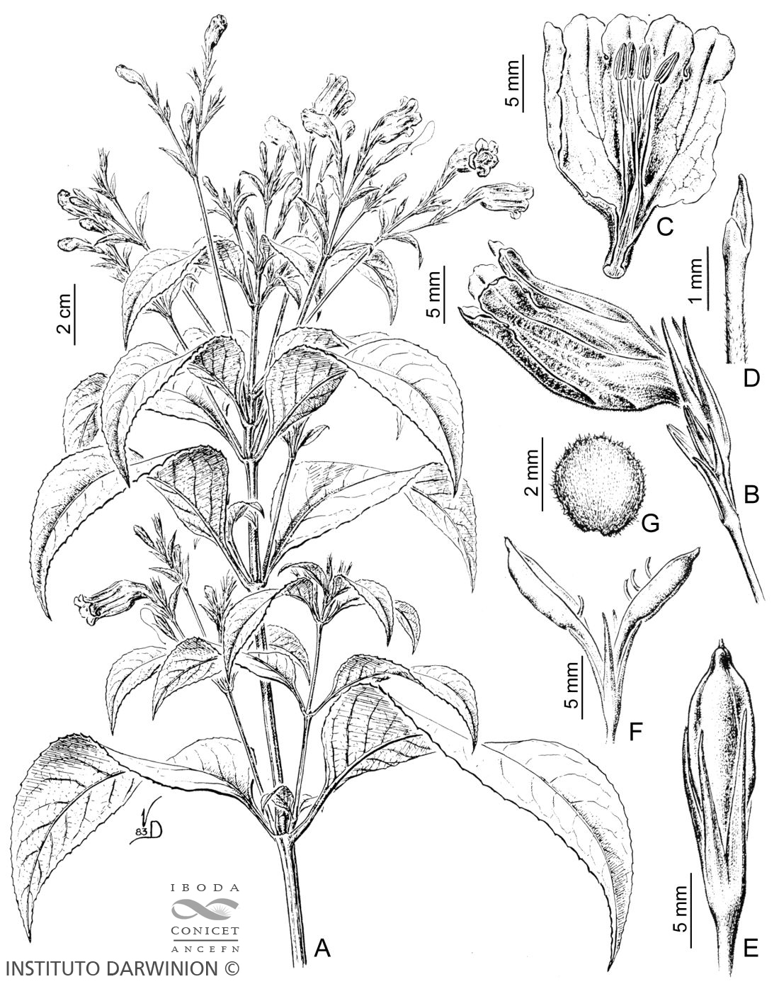 Sufrútice o subarbusto hasta de 1 m de alto, rizomatoso, con tallos ascendentes, a veces apoyantes y enraizadores en la base, obtusamente cuadrangulares, generalmente glabros. Hojas opuestas con pecíolo de 1-5 cm de largo; láminas ovadas, de 4- 15 × 1,5-8 cm, acuminadas en el ápice, cuneadas en la base, onduladas e irregularmente dentadas en el margen, glabras. Flores dispuestas en dicasios laxos, agrupados en cimas pedunculadas axilares multifloras; yemas supernumerarias frecuentes; bractéolas ovadas o lanceoladas, foliáceas, más grandes que los lóbulos del cáliz; cáliz de 5-10 mm de largo con los segmentos lineales, de menos de 1 mm de ancho, agudos, pubescentes; corola roja de 2,5-3 cm de largo, con tubo basal angosto de 0,5-1 cm de largo, curvado y ampliado en el ápice en una garganta inflada de 1-2 × 0,5-1 cm en su parte media, luego más angosta; lóbulos suborbiculares más o menos erectos, pequeños, de 2-3 mm de largo, retusos; estambres subexertos con filamentos ca. 9 mm de largo y anteras de 3 mm de largo, basalmente apiculadas. Cápsulas de contorno claviforme, de 1- 1,5 × 0,3 cm, sólido-estipitadas hasta ca. 3 mm de altura. Semillas unas 12, ca. 2 mm de diámetro; retináculos ca. 2 mm de largo.