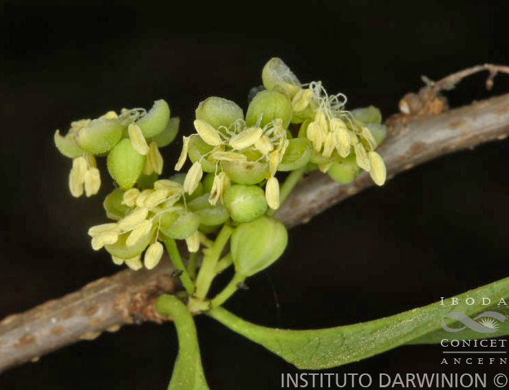 Árbol o arbusto de 2-10 m de alto, espinosos o inermes, glabros a pubescentes. Hojas de 2-8(-11) × 1-3(-4,5) cm, alternas o reunidas en fascículos de 2-5 sobre braquiblastos, elípticas a lanceoladas, de base atenuada, ápice agudo a mucronado, con el nervio medio prominente en la cara abaxial, cartáceas, glabras a densamente pubescentes en la cara abaxial y algo pubescentes en la cara adaxial; pecíolo de 3-12 mm de largo, canaliculado en la cara superior, glabro a pubescente. Inflorescencia de 2-6 cm de largo, paniculadas, axilares, a veces nacen sobre braquiblastos, raquis glabro o pubescente, con 1-8(-10) flores de 4-5 mm de largo, pedicelo de 1-3 mm de largo, engrosado en el ápice, brácteas y bractéolas de 0,5-1 mm de largo, estrechamente triangulares; tépalos de 2,5-4 × 1,8-3 mm, elíptico-obovados, con el ápice redondeado o emarginado; flores estaminadas con (8-)14-18(-20) estambres, de 3-4 mm de largo; flores pistiladas con el ovario de 3-3,5 mm de largo, elipsoide u obovoide, ramas estigmáticas de 1-4,5 mm de largo, lineares, filiformes y engrosados o no en la base, papilosos. Fruto una baya globosa de 5-6 × 4-5 mm, blanca, traslúcida. Var. praecox.- Se diferencia de la otra variedad y de las otras formas principalmente por presentar las hojas adultas densamente pubescentes.