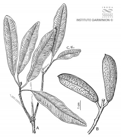 Árbol que puede alcanzar gran porte, hasta 35 m de alto. Hojas alternas (a veces subopuestas); pecíolo de 0,7-1,5 cm de largo; lámina angostamente obovada a oblonga o elíptica, de 4-12 × 1-4 cm, firmemente membranácea a coriácea, glabra, concolora, con numerosas venas secundarias y terciarias claramente visibles en ambas caras, uniéndose cerca del margen en una vena intramarginal notoria; ápice obtuso o redondeado, a veces cortamente acuminado; base más o menos cuneada. Inflorescencias multifloras, subterminales, de 1-3 cm de largo, pubérulas; brácteas diminutas; pedicelos ca. 1 mm de largo. Flores con cáliz con lóbulos anchamente ovados, agudos a redondeados, de 0,5-1 mm de largo, adpreso-pubérulos; corola hipocraterimorfa, blanquecina; tubo cilíndrico de 2,5-3 mm de largo, levemente dilatado a la altura de los estambres, exteriormente adpreso-pubérulo a casi glabro; lóbulos ovados, de 0,5-1,5 mm de largo, semierectos; estambres insertos por encima de la mitad del tubo corolino; anteras de 0,5 mm de largo; ovario ovoide ca. 0,5 mm de largo, pubescente. Folículos de contorno oblongo, alargados, levemente comprimidos, hasta de 6 × 1,5 cm, lenticelados, con la base no contraída y el ápice a veces apiculado; pedicelo del folículo apenas acrescente. Semillas con ala papirácea excéntrica, basal.