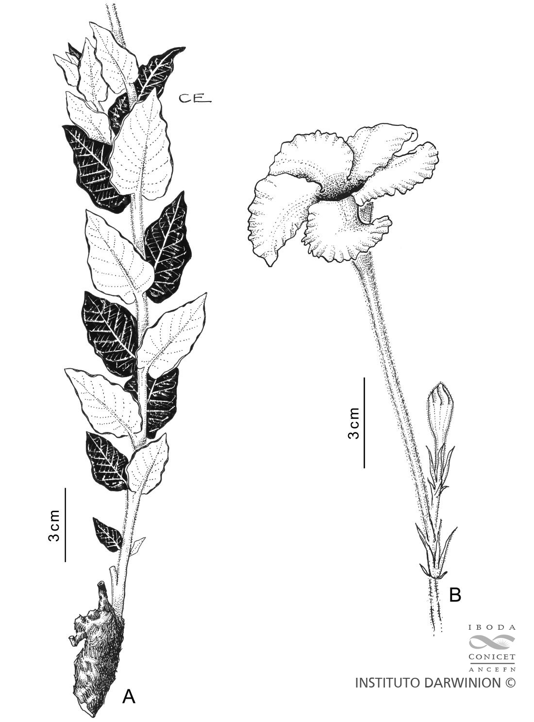 A. Base de una planta con xilopodio. B. Inflorescencia apical con una flor y botón floral.