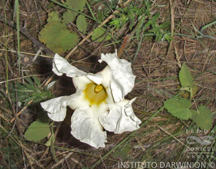 Hierba perenne, de 20-50 cm de alto, provista de xilopodio; tallos decumbentes, ramificados, pilosos en sus partes jóvenes, glabrescentes a la madurez. Hojas subsésiles en verticilos 3(-4)-meros (excepcionalmente opuestas en algunos sectores), oblongas, oblongo-lanceoladas o lineales, de 1-4 × 0,1-1 (-1,5) cm, laxamente pilosas y glabrescentes (a veces muy levemente lanuginosas) en la cara adaxial, densamente albo-lanosas en la cara abaxial, ápice agudo, base truncada a redondeada, margen revoluto, a veces levemente ondeado. Inflorescencias con racimos de 1-3 flores; pedúnculo de 3-10 cm de largo; brácteas lineal-lanceoladas, de 0,4-1 cm de largo. Flores blancas ca. 12 cm de largo; cáliz de lóbulos lanceolados, de 1-2,5 cm de largo, lanosos en su exterior; corola con la base contraída en un tubo de 8-12 cm de largo por debajo de la inserción de los estambres, garganta cilíndrico-turbinada, de 1,3-1,8 cm de largo, lóbulos asimétricos, oblicuamente ovados, de 2,5-3 cm de largo, con el margen crespo; anteras de 1 cm de largo; ovario ovoide, de 0,3 cm de largo; nectarios oblongos, comprimidos, más o menos unidos entre sí, de menor altura; estilo filiforme ca. 11 cm de largo; cabeza estilar de 4 mm de largo. Folículos de 9-25 cm de largo, levemente lanuginosos, glabrescentes. Semillas de 1-1,3 cm de largo, con penacho de pelos leonados de 2-2,5 cm de largo.