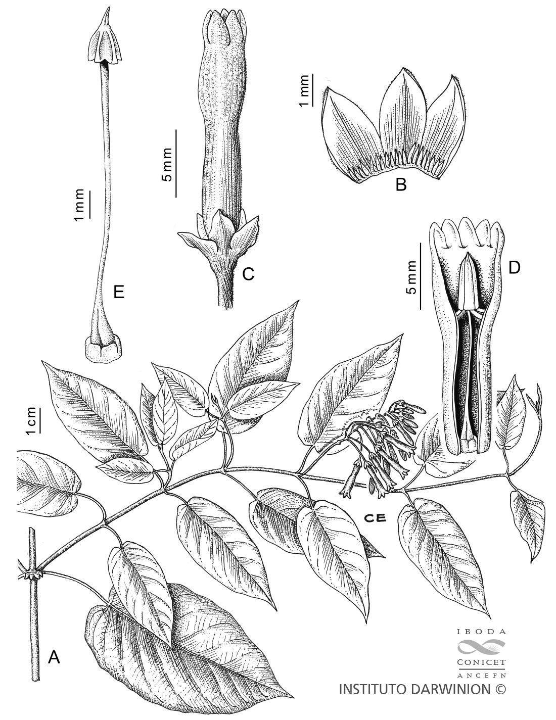 Planta trepadora de tallos volubles, pubérulos, glabrescentes; apéndices nodales triangulares, comprimidos, formando un anillo dentado alrededor del tallo a la madurez. Hojas opuestas; pecíolo de 1-3 cm long.; lámina angostamente ovada, de 5-10 x 2-5,5 cm, glabra en el haz, con un grupo de apéndices glandulares en la base del nervio medio, y pubérula, o al menos con mechoncitos de pelos en las axilas de los nervios secundarios en el envés; base levemente cordada y ápice acuminado. Inflorescencias en racimos laterales de 5-15 cm long., portando 5-15 flores moradas de aprox. 1,5 cm long.; brácteas lanceoladas de 0,1-0,3 cm long., tempranamente caducas; pedicelos de 0,6-1,2 cm long. Cáliz de lóbulos triangulares de 0,2-0,3 cm long., levemente acuminados, escariosos en el margen y con una hilera casi continua de apéndices glandulares en sus bases, del lado interno. Corola tubulosa con la base apenas contraída en un tubo de 0,9-1 cm long.; garganta de 0,5 cm long. Anteras con el ápice levemente acuminado y la base truncada, de aprox. 0,5 cm long. Ovario ovoide de aprox. 1,5 mm long.; nectarios 5, oblongos, comprimidos, de menor altura. Estilo de cerca de 1 cm long.; cabeza estigmática de 2 mm long. Folículos angostamente cilíndricos, subparalelos, levemente surcados, de 15-30 cm long. x 0,4 cm diám. Semilla de contorno oblongo, comprimida, de 0,8-1,2 cm long., con penacho de pelos de cerca de 2 cm long.