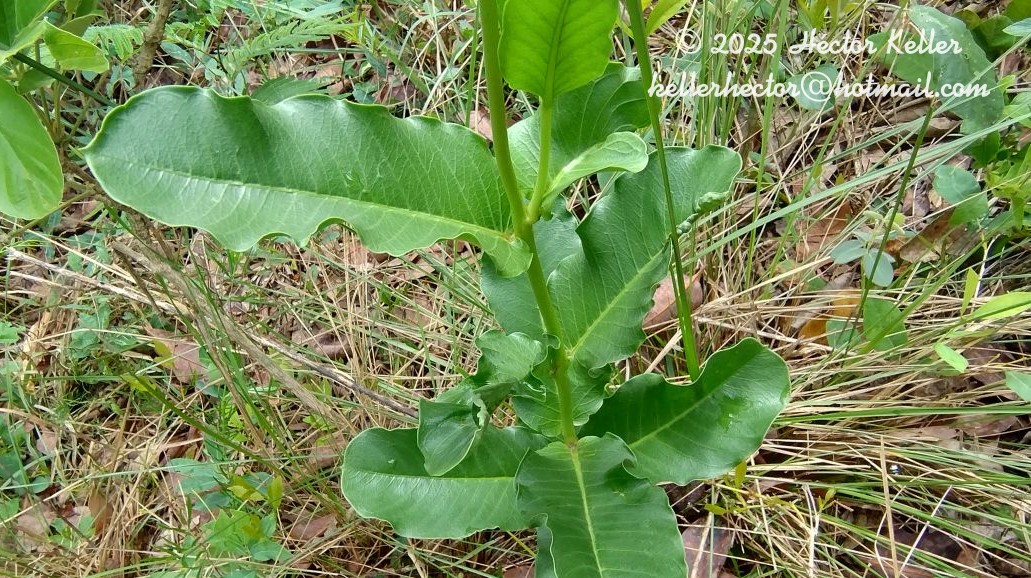 Hierba de hasta 50 cm alt., provista de xilopodio, con tallos erectos, glabros o pubescentes y apéndices nodales obsoletos. Hojas opuestas, subsésiles; pecíolo de 0,1-0,5 cm long.; lámina ovado- u obovado-oblonga a orbicular, de 3,5-12 x 1,5-6 cm, glabra a levemente pubescente, con el ápice brevemente acuminado (a veces retuso) y la base redondeada; apéndices glandulares poco notables en la base del nervio medio, en el haz. Inflorescencias en racimos paucifloros, terminales, de 15-25 cm long.; brácteas lanceoladas de aprox. 0,5 cm long.; pedicelos de 1-2 cm long. Flores de 5-8 cm long., rosadas, en número de 2-10 por racimo. Cáliz de lóbulos lanceolados de 0,5-1,2 cm long., agudos, con grupos de cerca de 4 apéndices glandulares alternando con sus bases, del lado interno. Corola hipocraterimorfa con la base contraída en un tubo de 0,5-1,2 cm long., glabro; garganta cilíndrica a cilíndrico-turbinada de 3-5,5 cm long., glabra; lóbulos asimétricos, oblicuamente obovados, de 2-3 cm long., patentes. Anteras de aprox. 0,8 cm long. Ovario ovoide de aprox. 0,2 cm long.; nectarios 5, anchamente oblongos, comprimidos, más o menos soldados entre sí, de menor altura. Estilo de aprox. 1 cm long.; cabeza estigmática de 2 mm long. Folículos angostamente cilíndricos, de 20-30 cm long. x 0,7 cm diám. Semilla de contorno oblongo, de 0,8 cm long., con penacho de pelos de 2 cm long.