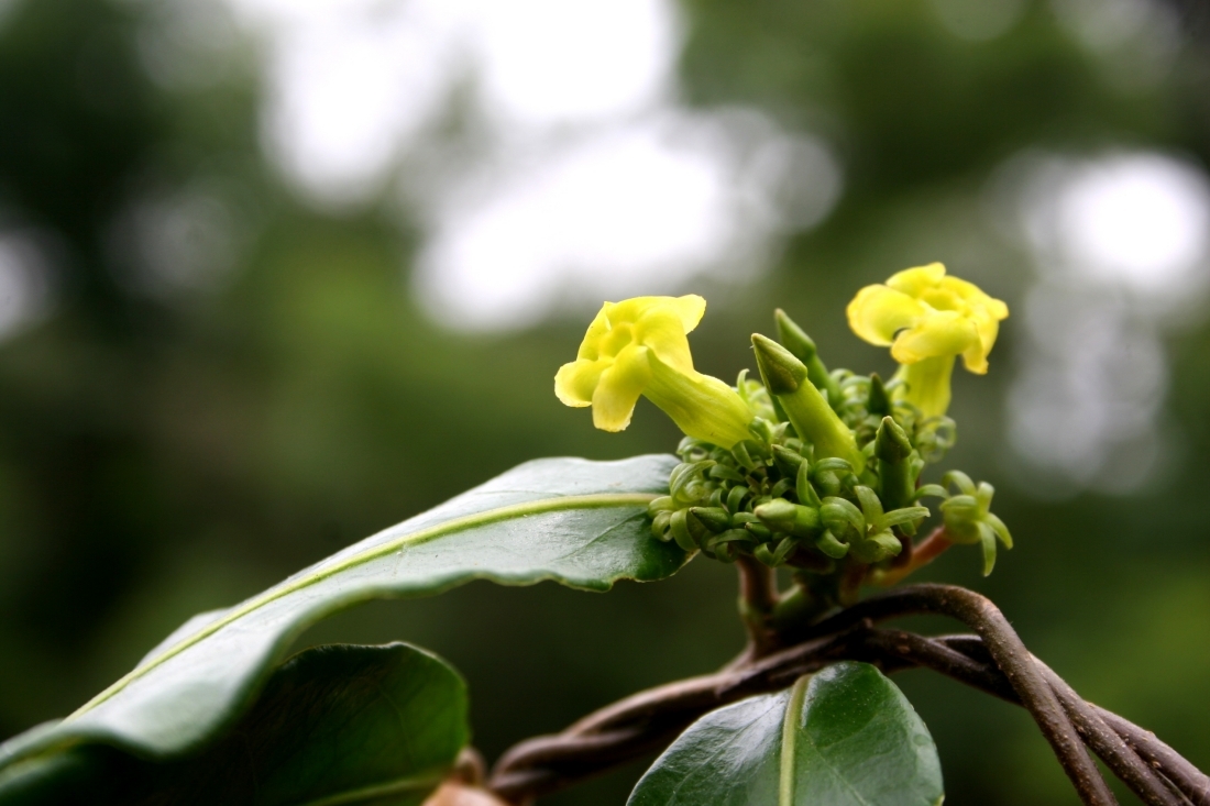 Planta trepadora de tallos volubles, delgados, pubérulos. Hojas con pecíolo de 0,5-1 cm long.; lámina angostamente elíptica a ovada, a veces obovado-angosta, de 5-13 x 2-5 cm, cartácea, glabra en el haz y muy cortamente adpreso-pubérula en el envés, con ápice agudo y apiculado y base obtusa o redondeada. Inflorescencias corimbiformes; pedúnculo de 0,3-0,8 cm long.; brácteas triangular-lanceoladas, diminutas; pedicelos de 0,4-1 cm long. Flores de cerca de 1,5 cm long., amarillo-verdosas. Cáliz de lóbulos oblongo-lanceolados, erectos, de 0,4-0,6 x 1 mm, foliáceos, exteriormente pubérulos; apéndices glandulares comprimidos, de contorno deltoide, lacerados. Corola hipocraterimorfa con tubo cilíndrico de 1-1,5 cm long.; apéndices epiestaminales ausentes; fauces con anillo calloso poco marcado; lóbulos patentes, asimétricos, oblicuamente obovados, de 0,5 cm long. y 0,4 cm lat. aprox. Anteras sagitadas de 0,5 cm long., alojadas en la mitad del tubo corolino, con caudículas basales angostas. Ovario ovoide 0,1 cm long.; nectarios anchamente oblongos, comprimidos, de menor altura. Folículos paralelos, unidos hasta la madurez, muy estrechamente cilíndricos, levemente torulosos, de 25-30 cm long., pubérulos. Semillas de contorno oblongo, de cerca de 0,8 cm long., con penacho de pelos blancos de cerca de 3 cm long.