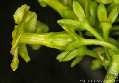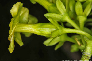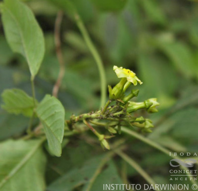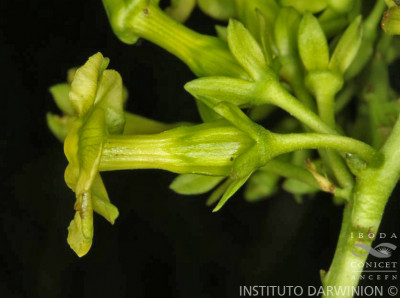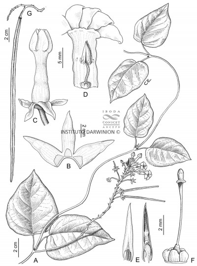 Planta trepadora de tallos volubles, delgados, glabros. Hojas con pecíolo de 0,5-3 cm de largo; lámina elíptica a ovada, de 3-11 × 2,5-6(-9) cm, membranácea, glabra, con ápice agudo y acuminado y base cuneada, obtusa o levemente cordada. Inflorescencias racemiformes; pedúnculo de 2-7 cm de largo; brácteas triangulares, diminutas; pedicelos de 0,5-1 cm de largo. Flores ca. 1,3 cm de largo, amarillo-verdosas; cáliz con lóbulos ovados a anchamente oblongos, de 0,3-0,5 × 0,15-0,25 cm, extendidos, semierectos, foliáceos; apéndices glandulares comprimidos, de contorno trapezoidal, lacerados; corola hipocraterimorfa con tubo cilindro-cónico, de 1-1,3 cm de largo; apéndices epiestaminales de menos de 1 mm de largo; fauces con anillo calloso marcado; lóbulos asimétricos, oblicuamente obovados, de 4-6 × 4 mm; anteras sagitadas, de 5 mm de largo, totalmente inclusas, alojadas en el tercio medio del tubo corolino, glabras, con caudículas basales subuladas, agudas; ovario ovoide de 1,5 mm de largo; nectarios anchamente oblongos, comprimidos, de la mitad de su altura; estilo de 5 mm de largo; cabeza estilar de 1 mm de largo. Folículos estrechamente cilíndricos, de 15-25 cm de largo, paralelos, unidos hasta la madurez, levemente estriados, glabros. Semillas de contorno oblongo, inconspicuamente rostradas, de 5-8 mm de largo, con penacho de pelos blancos de 2-3 cm de largo.