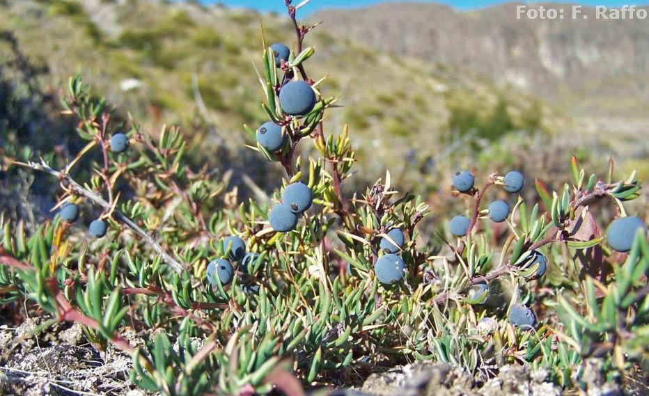 Subarbusto rastrero, ca. 0,50 m de alto, a menudo formando cojines; ramas de sección angulosa, glabras, castaño-claras a rojo-vinosas, frecuentemente con raíces adventicias de poco diámetro; nudos notables y entrenudos de 7-8 mm de largo; espinas ca. 4 mm de largo, generalmente 3-fi das, divaricadas, castaño-claras, glabras, brillantes, la espina media de 8-12 mm de largo, las laterales de 3-5 mm de largo, curvadas a veces hacia el ápice, punzantes, profundamente surcadas en la cara abaxial, ensanchadas en la base y semiamplexicaules, decurrentes, excepcionalmente muy reducidas, casi nulas; braquiblastos de 2-3 mm de largo, escamas muy pequeñas, castaño-claras. Hojas en fascículos de 8-10, aciculares, de 8-16 × 1-5 mm, de sección circular, mucronadas, coriáceas; pecíolo de 1 mm de largo, cara adaxial glabra, cara abaxial pubescente, oculta por los márgenes fuertemente revolutos hasta llegar a tocarse en la zona media. Flores solitarias o muy esporádicamente 2-3(-4) fasciculadas; pedúnculos florales de 4-8 mm de largo; sépalos externos 3, oblongo-elípticos, de 3 × 1 mm; sépalos internos 3, obovados, de 5 × 3 mm; pétalos obovados de 3,5 × 2,5 mm, glándulas nectaríferas basales fusiformes; estambres 6, de 2,5-3 mm de largo, conectivo truncado, hendido o agudo y fi lamento con 2 apéndices uncinados debajo de las anteras; gineceo de 2,5 × 1,5 mm; ovario subgloboso y estigma sésil. Fruto una baya globosa, de 8 mm de diámetro, negro-azulada, pruinosa, estigma sésil. Semillas 4-8, rojizo-negruzcas.
