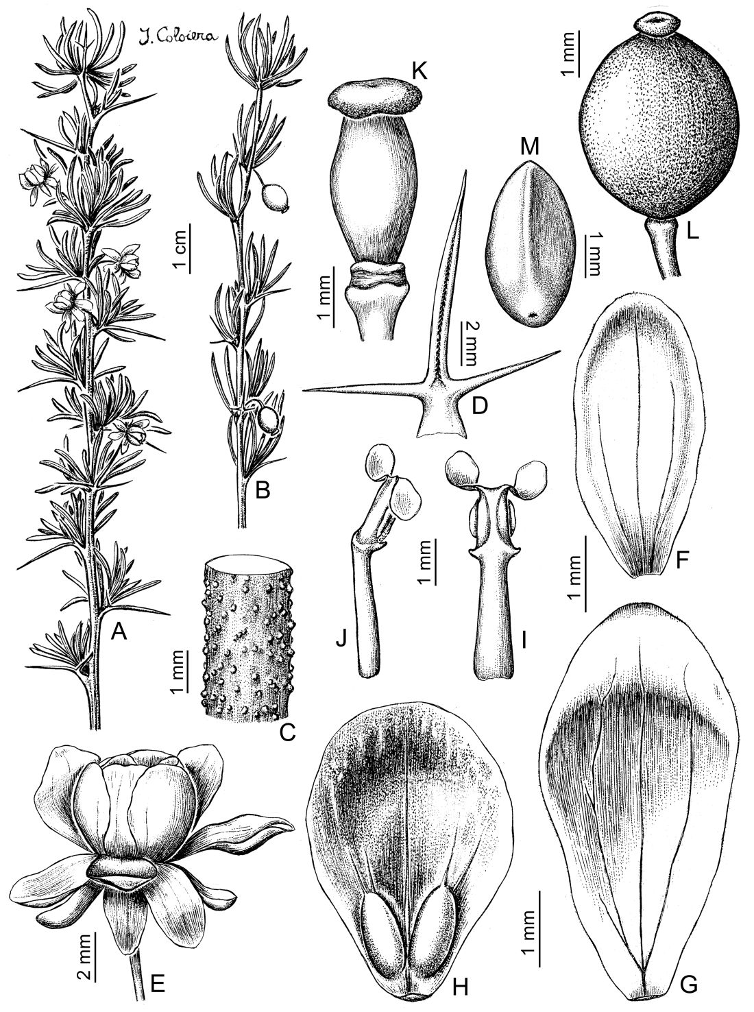 A. Rama florífera. B. Rama fructífera. C. Tallo, detalle. D. Espina. E. Flor. F. Sépalo externo. G. Sépalo interno. H. Pétalo con glándulas basales. I-J. Estambres con apéndices uncinados. K. Gineceo. L. Fruto. M. Semilla.