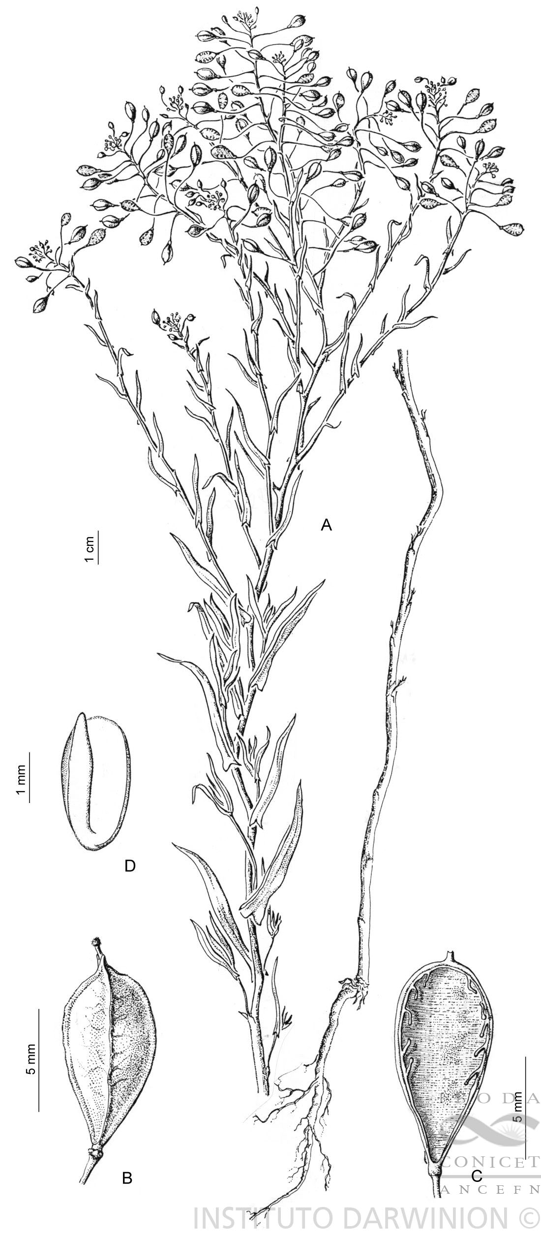 Hierbas anuales o bienales. Tallos de (12-)30-100(-130) cm de alto, simples o ramificados en la parte superior, glabros o escasamente pubescentes, con tricomas ramificados, pequeños, rara vez mezclados con otros pocos simples. Hojas basales a menudo marchitándose durante la antesis; hojas caulinares lanceoladas, estrechamente oblongas o linear-lanceoladas; hojas caulinares medias de (1-)2-7(-9) cm × 2-10(-15) mm, sagitadas o fuertemente auriculadas, ápice agudo, margen entero o rara vez algo denticulado, glabrescentes o escasamente pubescentes, con tricomas en su mayoria bífidos. Pedicelos fructíferos de (0,8-)1,2-2(-2,7) cm de largo, ascendentes. Sépalos de 2-3(-4) x 0,5-1 mm; pétalos amarillos, oblanceolados, de (3,5-)4- 6 × 1-1,5 mm; filamentos de 1,5-3 mm de largo; anteras ca. 0,5 mm de largo. Frutos piriformes o anchamente obovoides, de 7-9(-13) × 4- 5(-6) mm, a menudo subtruncados en el ápice; valvas prominentemente nervadas, margen angostamente alado; estilo de 1,2- 2,5 mm de largo. Semillas castaño oscuras, oblongoides, de (1,5-)1,8-2,5 × 0,7-1 mm. 2n = 40.
